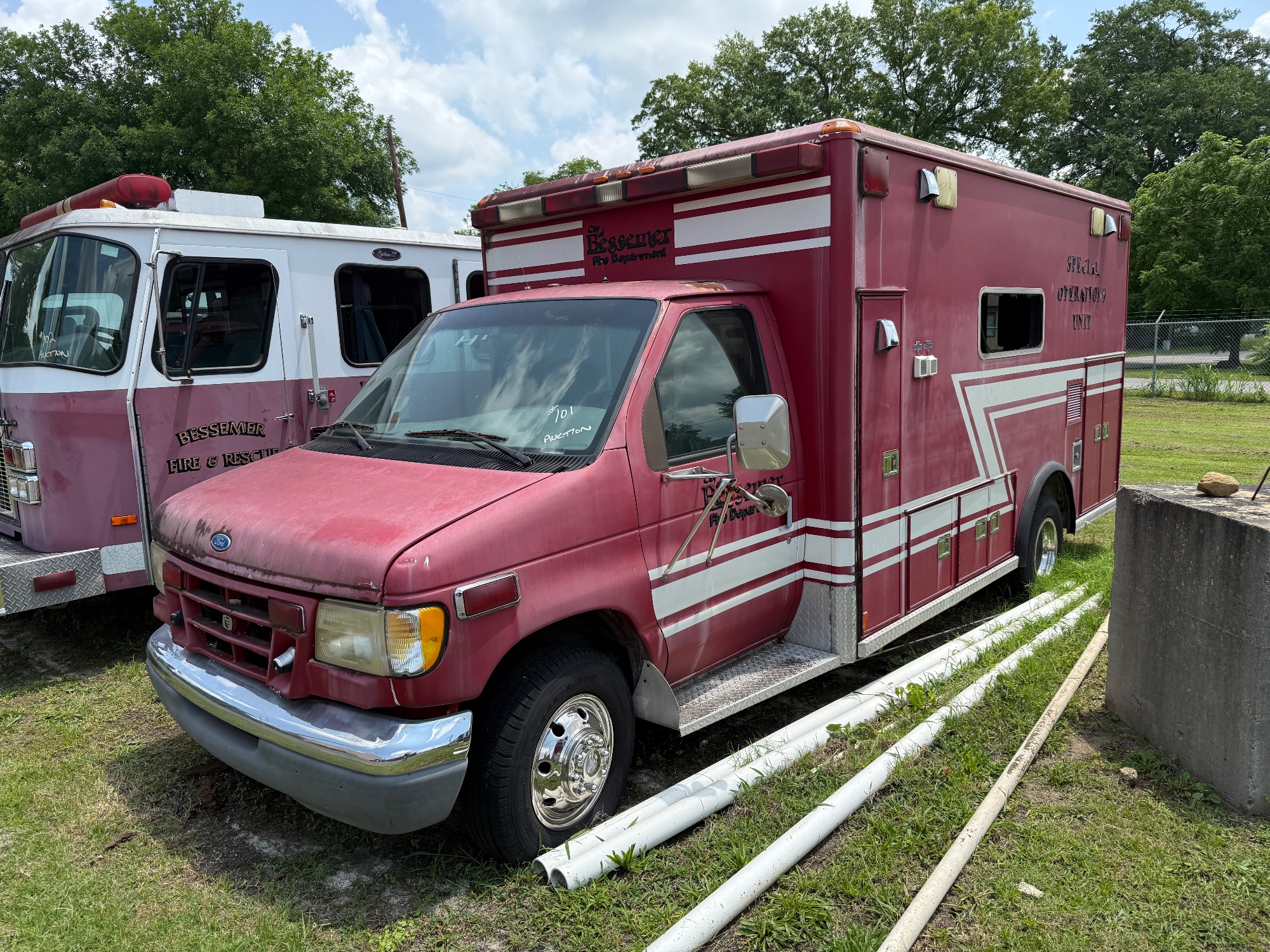 1997 Ford E-450 Ambulance, shows 198,319 miles, Vin# 1FDLE40F3VHA16434, Automatic, Diesel, Dually, Back Window Busted Out, Unknown Condition, Missing Parts under the hood, Been sitting for a while, Located at the Bessemer Fire Department