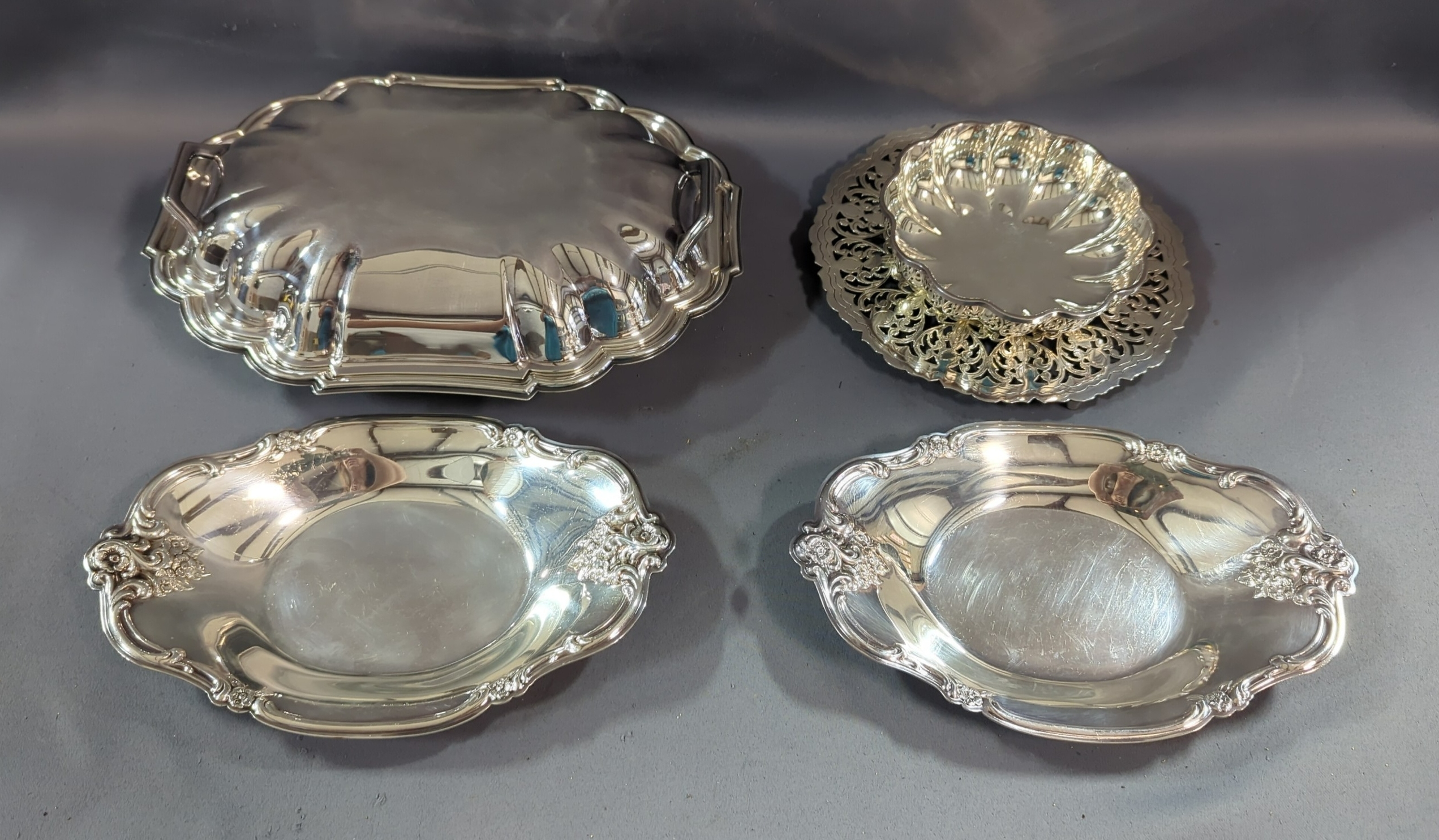 Newport Silverplate Covered Dish No YB19, International Silver Company Silver Toned Candy Tray No 448, Qty 2, And Halls Silver Toned Candy Bowl With Stand