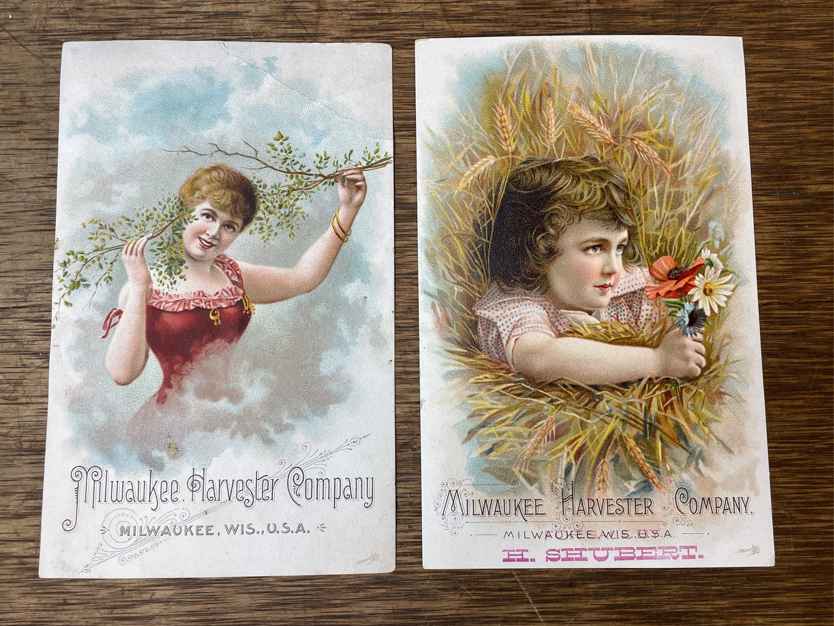 Two Milwaukee Harvester Co. trade cards. Both show wear and staining.