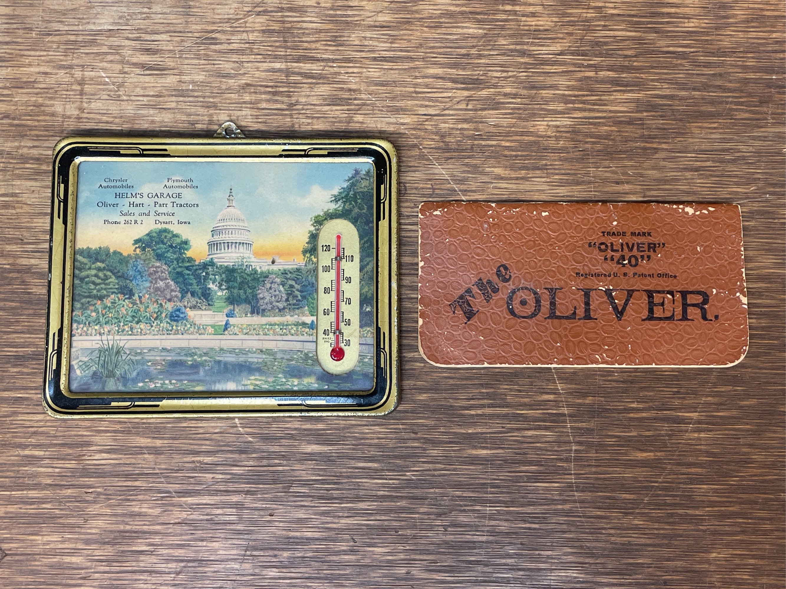 Oliver Hart-Parr Tractors thermometer from Helm's Garage. Shows light wear.