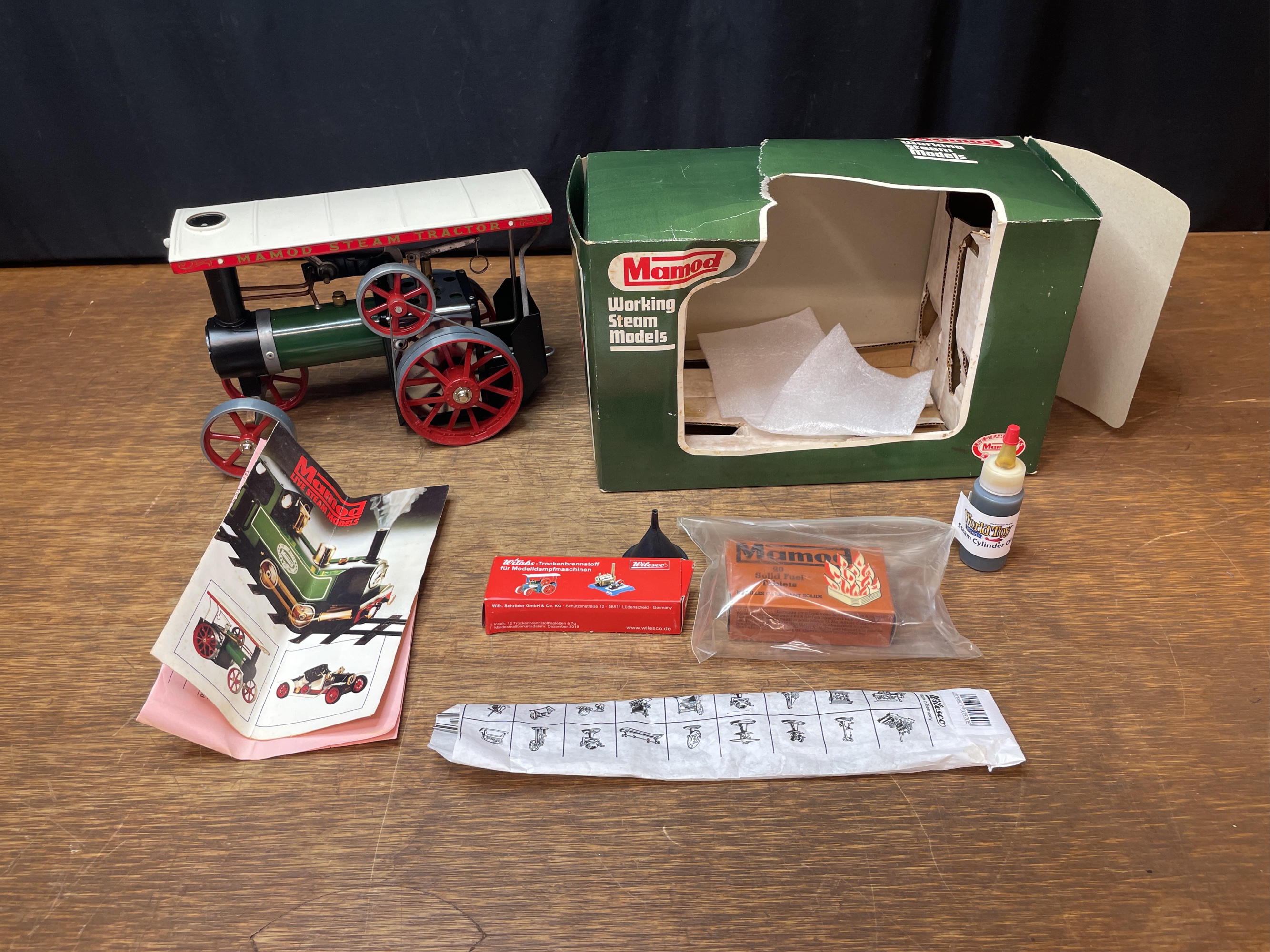 Manod working steam tractor NIB. Tractor in good condition. Box shows wear, tears, and damage. Includes fuel tablets, oil, and other accessories.