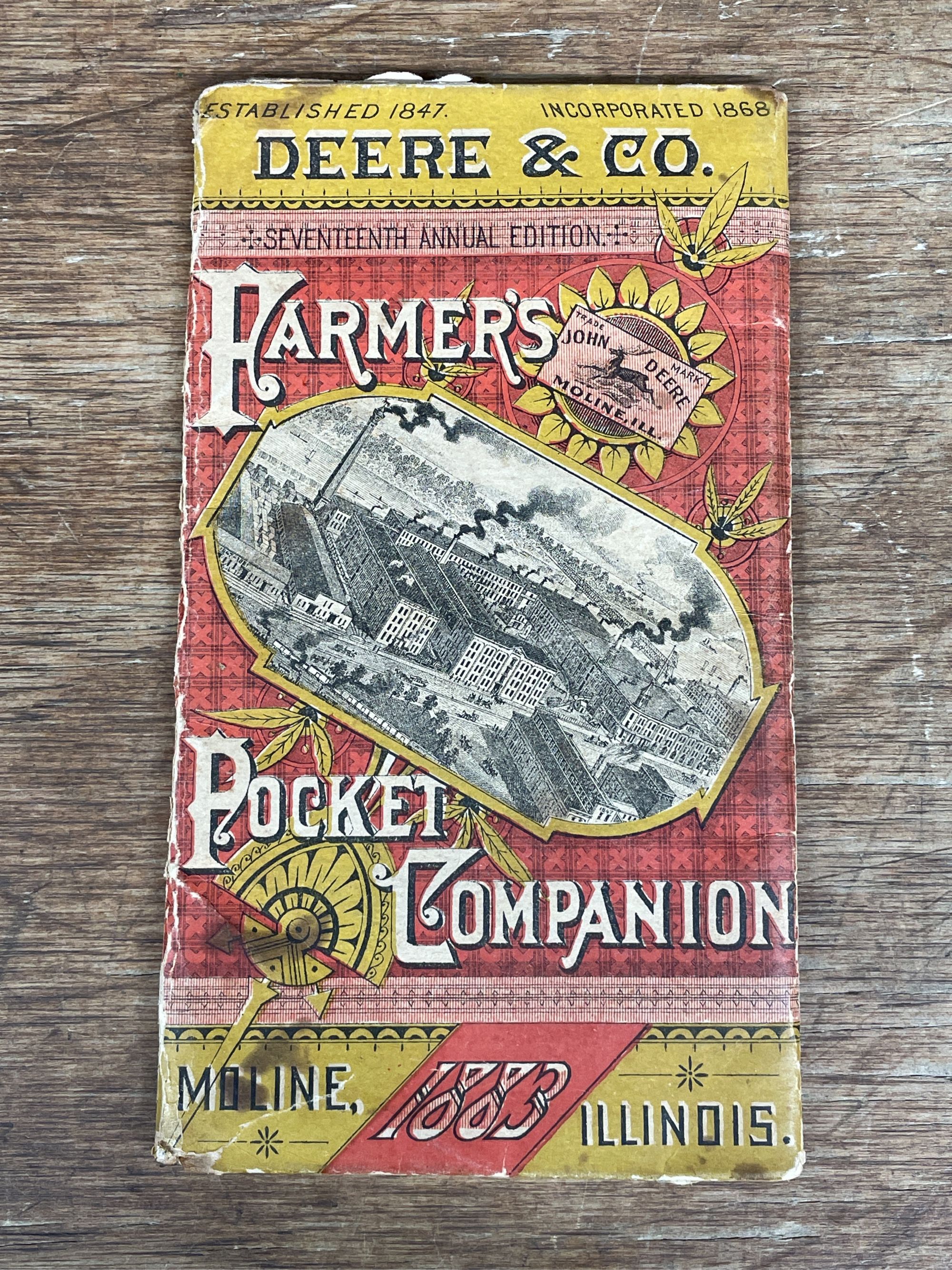 1883 Deere & Co. Farmers Pocket Companion. Shows wear, staining, and some writing inside.
