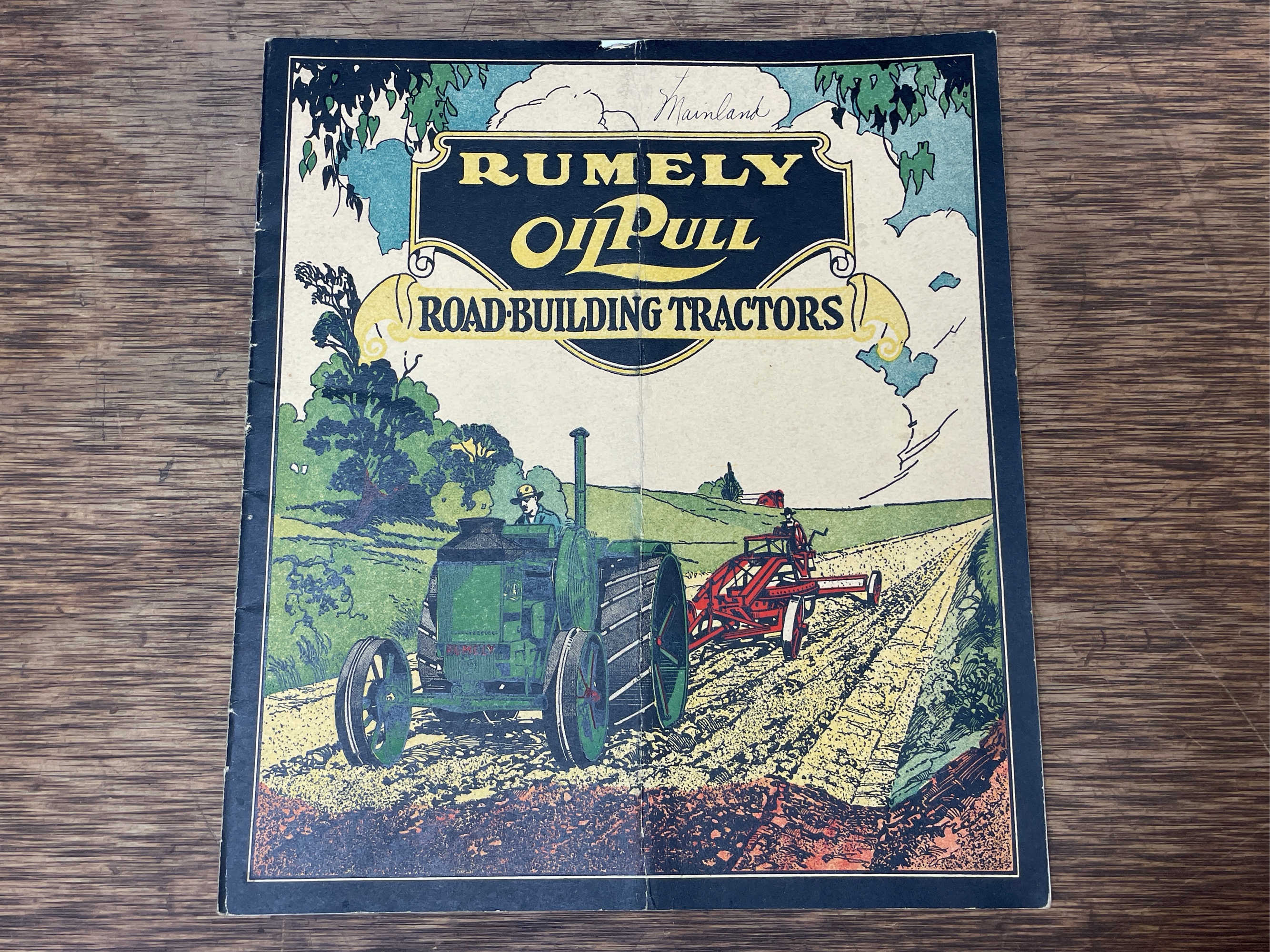 Rumely Oil Pull Road Building Tractors catalog. Shows wear and has been folded vertically. Name written on front cover.