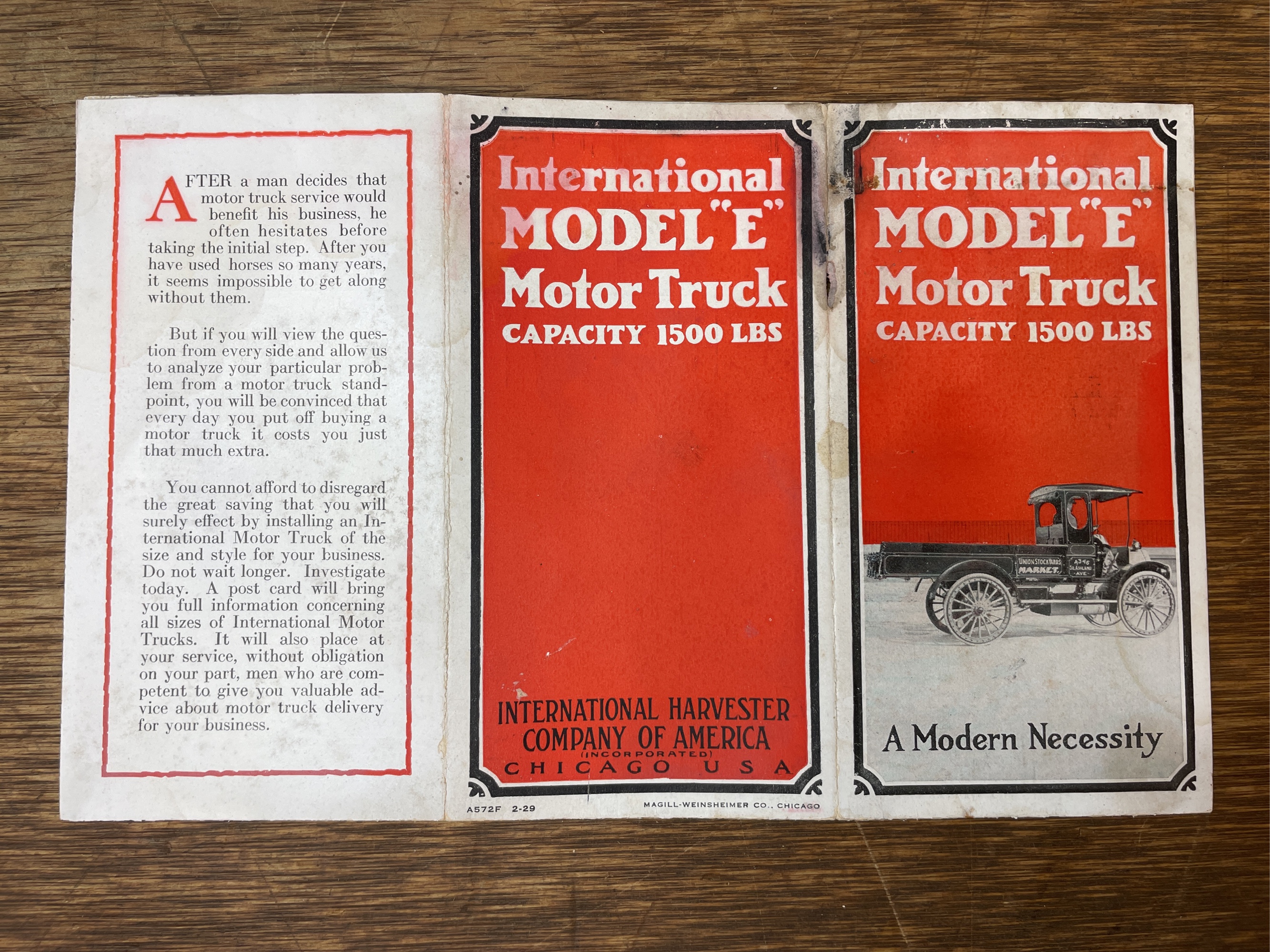 International Model E Motor Truck sales literature. Shows wear, staining, and splitting on folds.