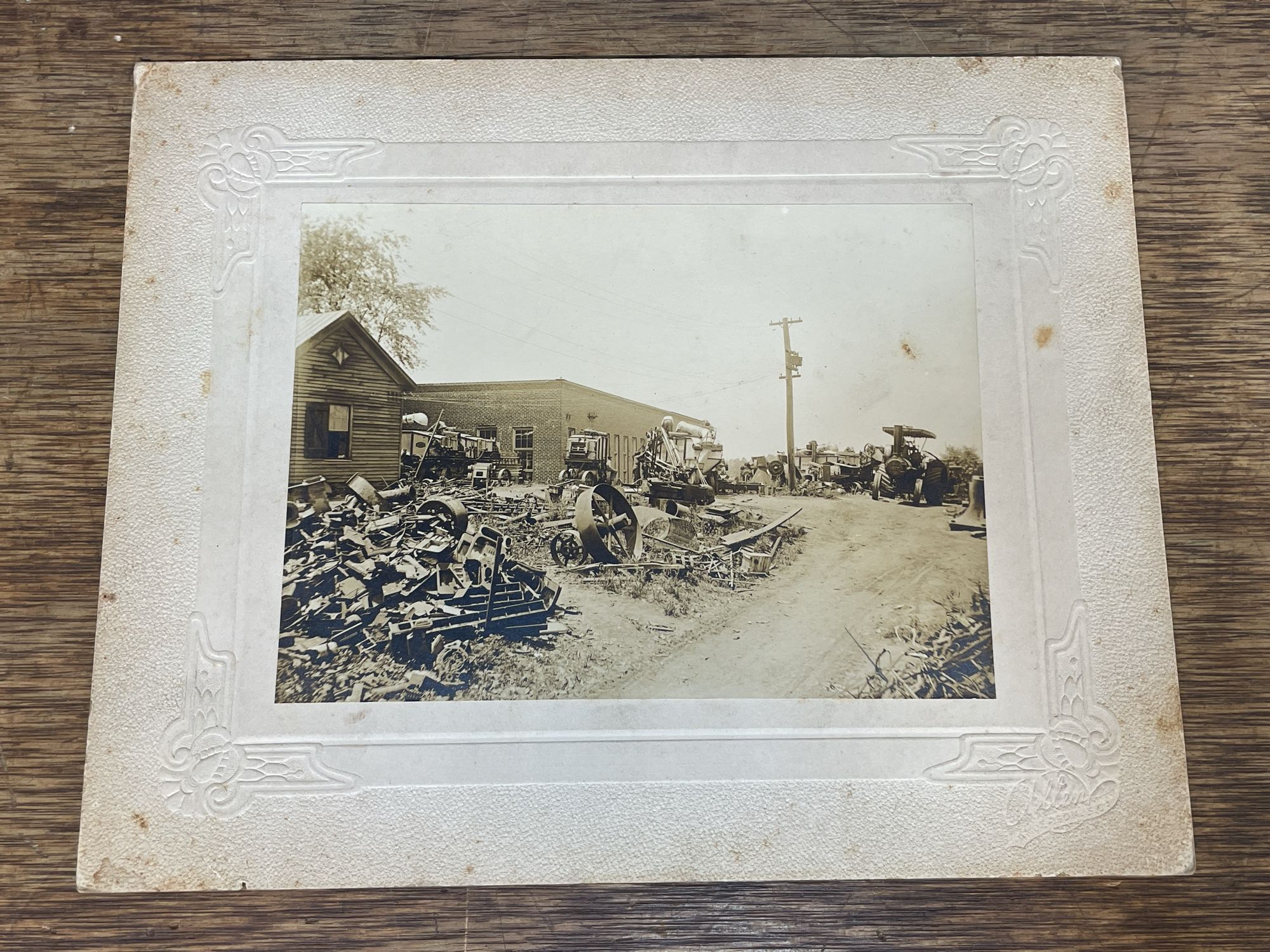Steam engine and threshers at machine yard photo. Shows wear and staining. 10"x8".