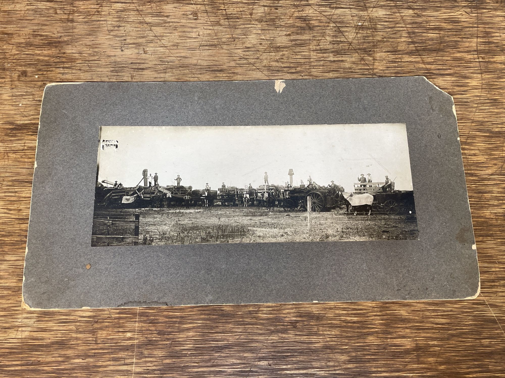 Advance steam engine with threshing outfit photo. Shows wear and corner damage. 13"x7".