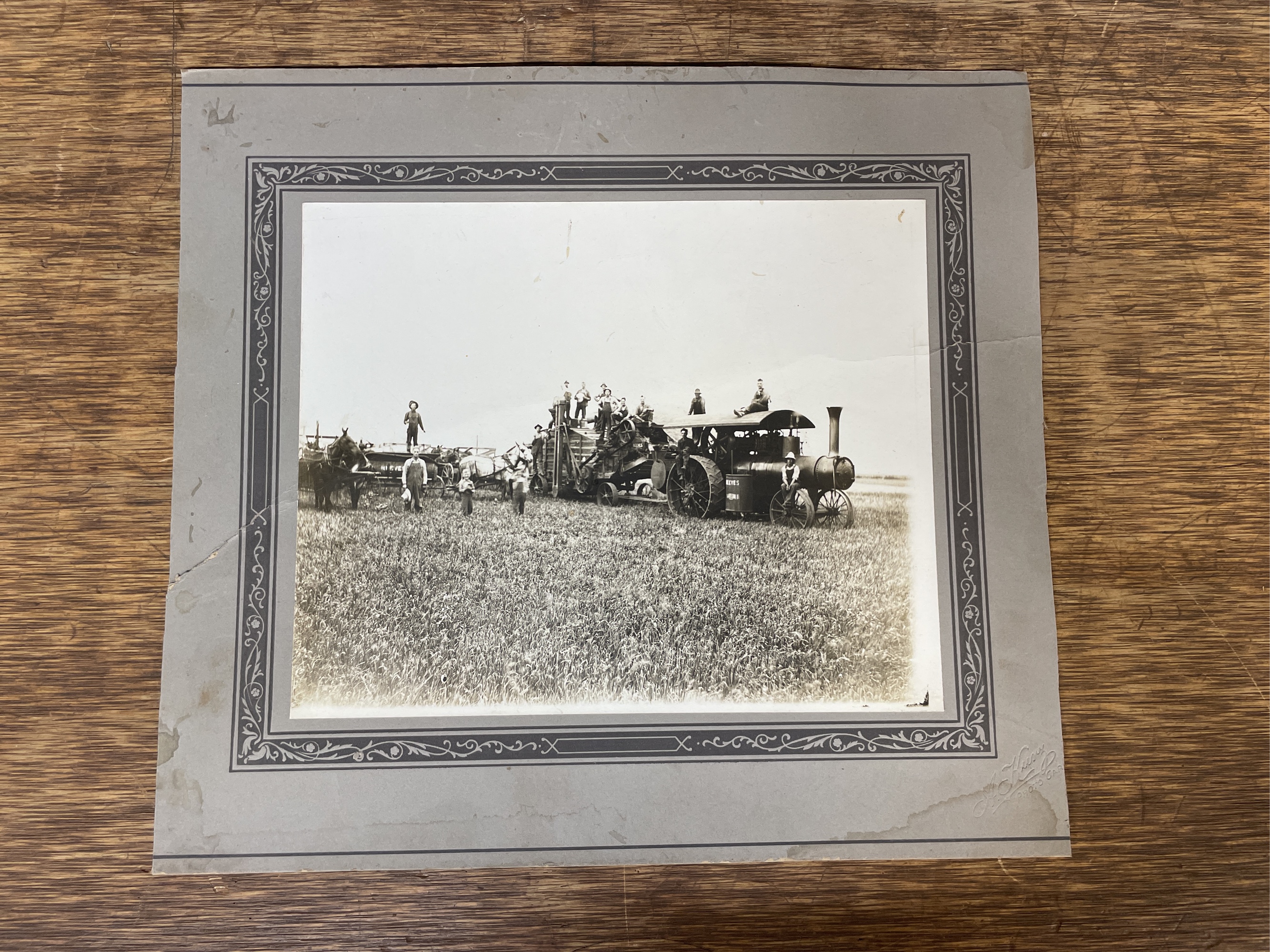 Reeves steam engine, thresher, and water wagon photo. Shows wear with some tears. 13.25"x12".