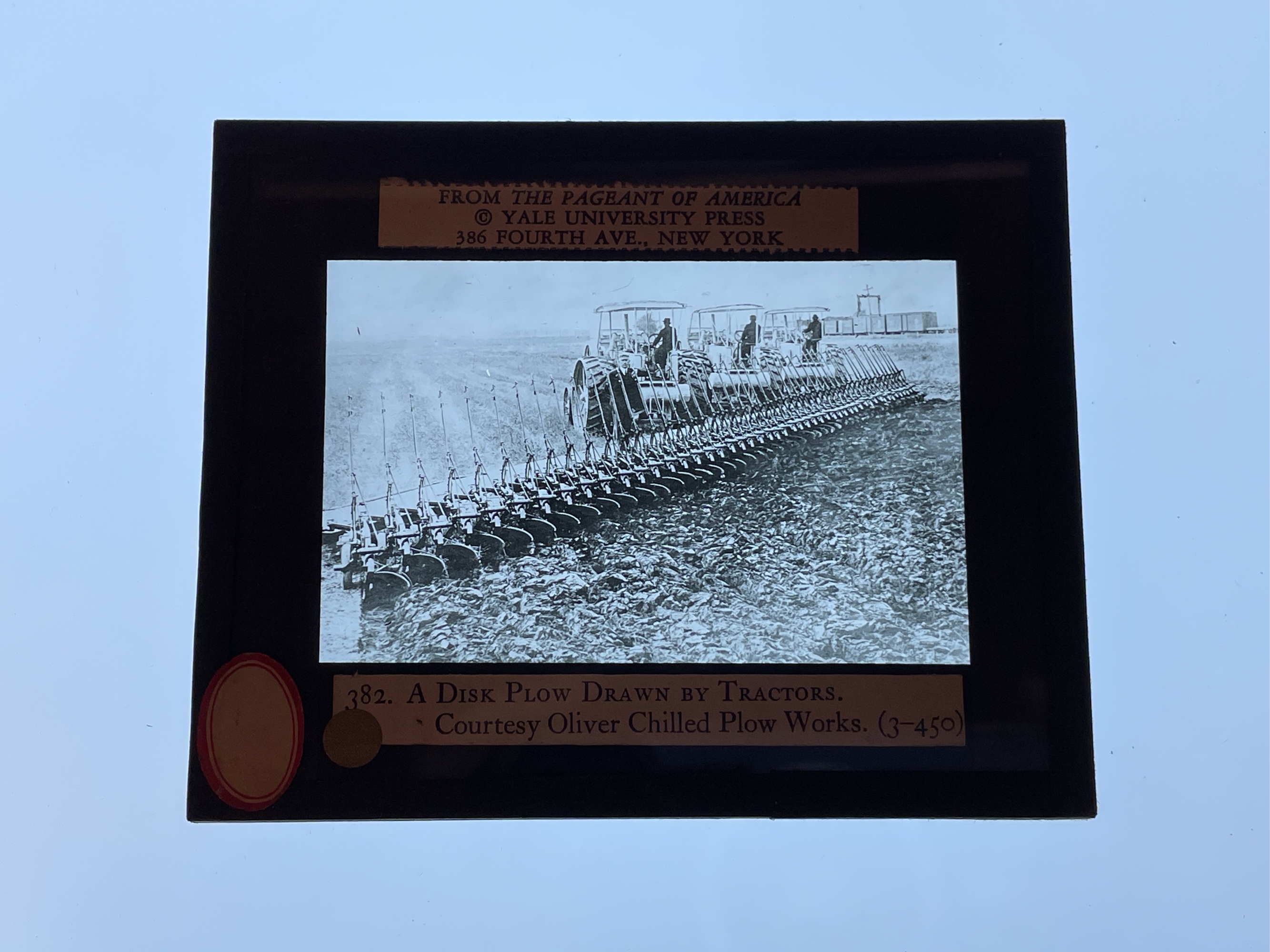 Oliver Chilled Plow large gang plow pulled by three tractors glass slide. Good condition.