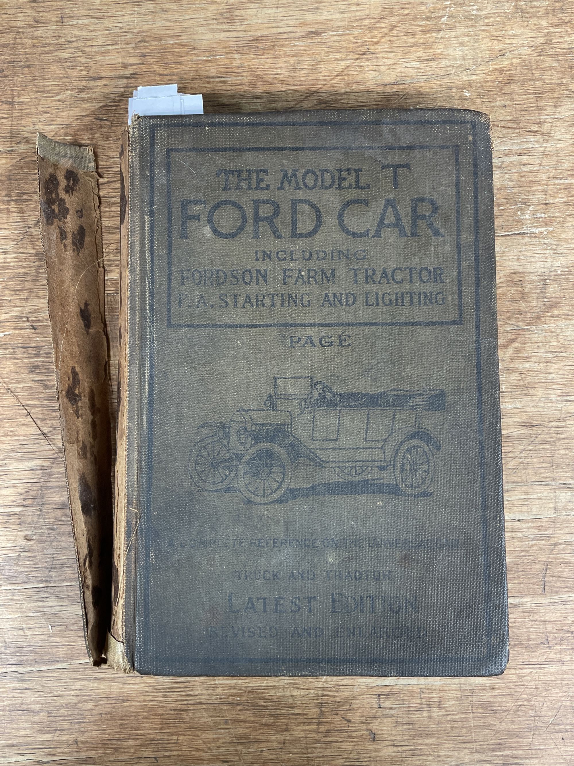 1924 Ford Model T Car book including Fordson farm tractor. Shows heavy wear and staining. Spine is barely hanging on.
