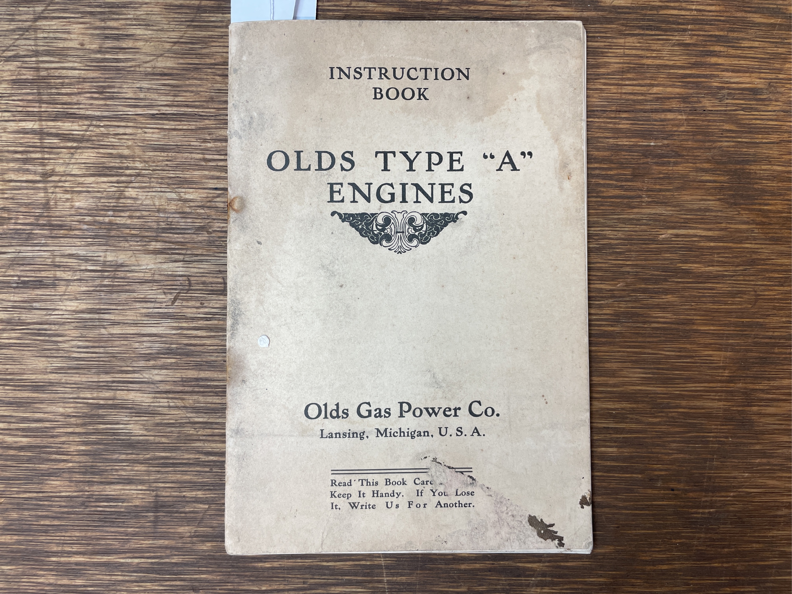 Olds Gs Power Co. Type A Engine Instruction Book. Shows wear and staining.
