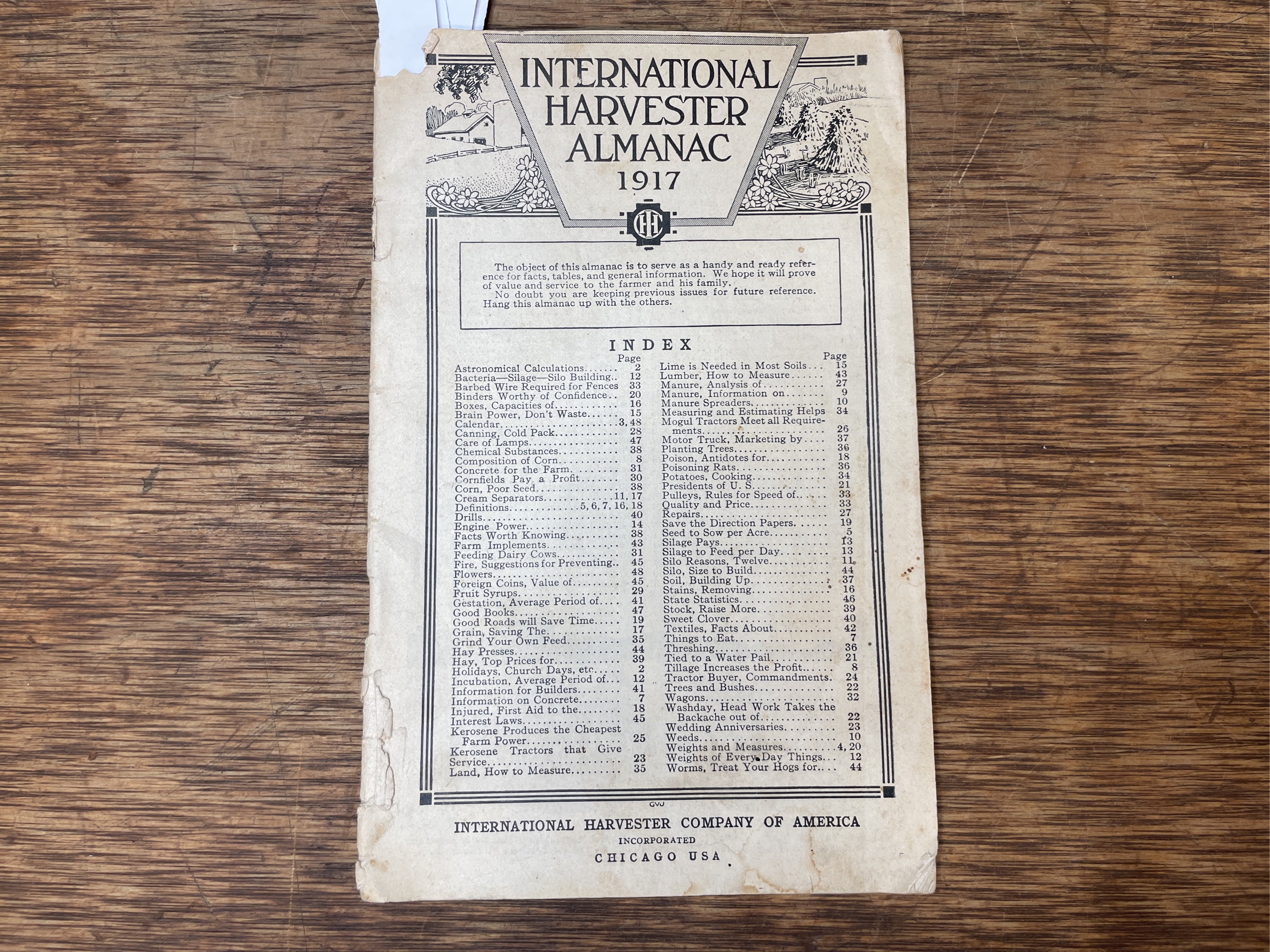 1917 IHC Almanac. Shows wear, staining, and missing covers.