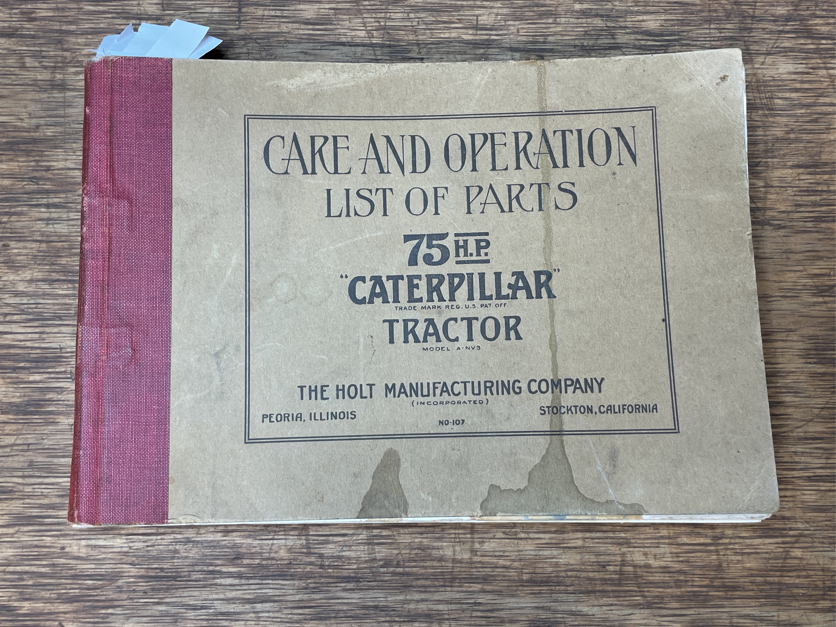 Holt Mfg. Co. Caterpillar 75 Operation + Parts Manual. Shows wear, staining, damage, and tape on binding.