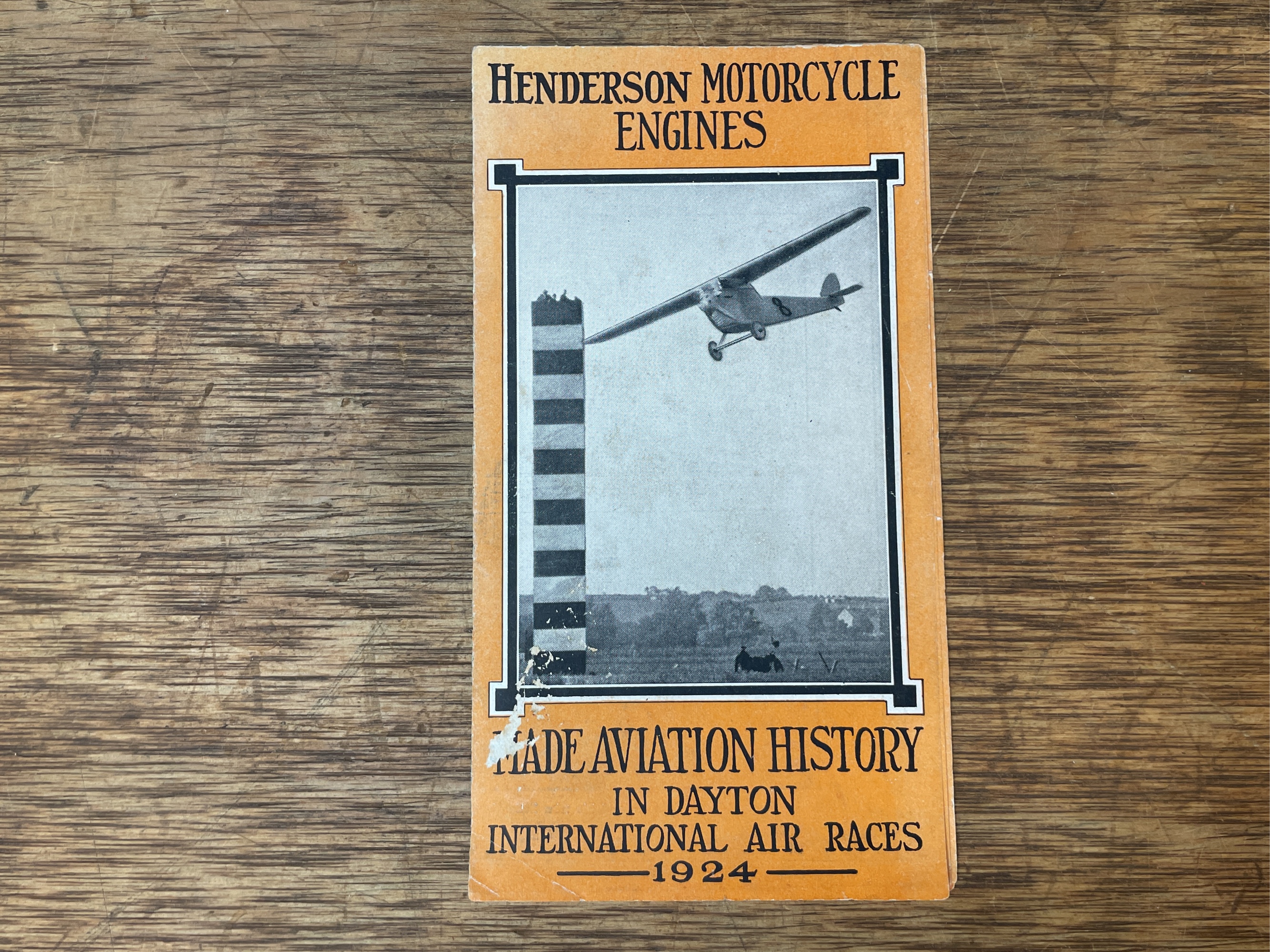 1924 Excelsior Motor Mfg. & Supply Co. Henderson Motorcycle Engines made aviation history in Dayton International Air Races literature. Shows wear, fading, and splitting on folds.