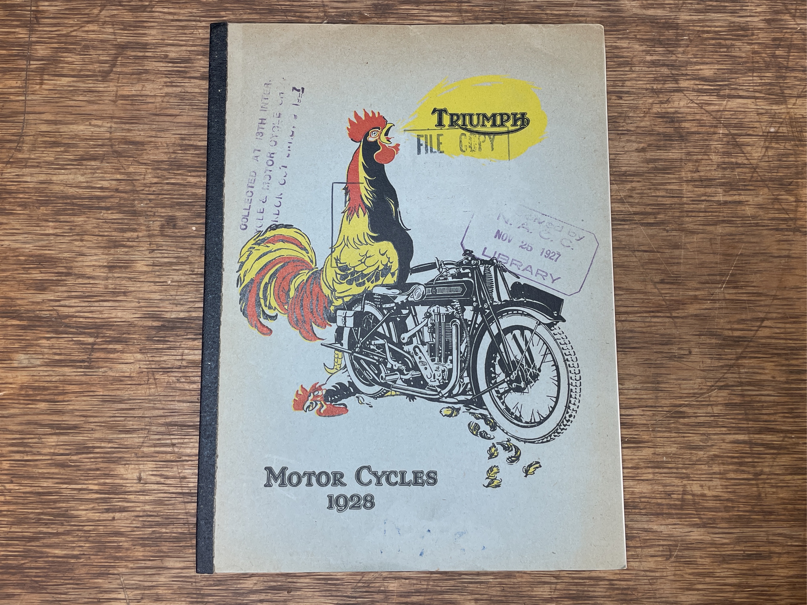 1928 Triumph Motorcycles catalog. Shows wear with damage on back cover.