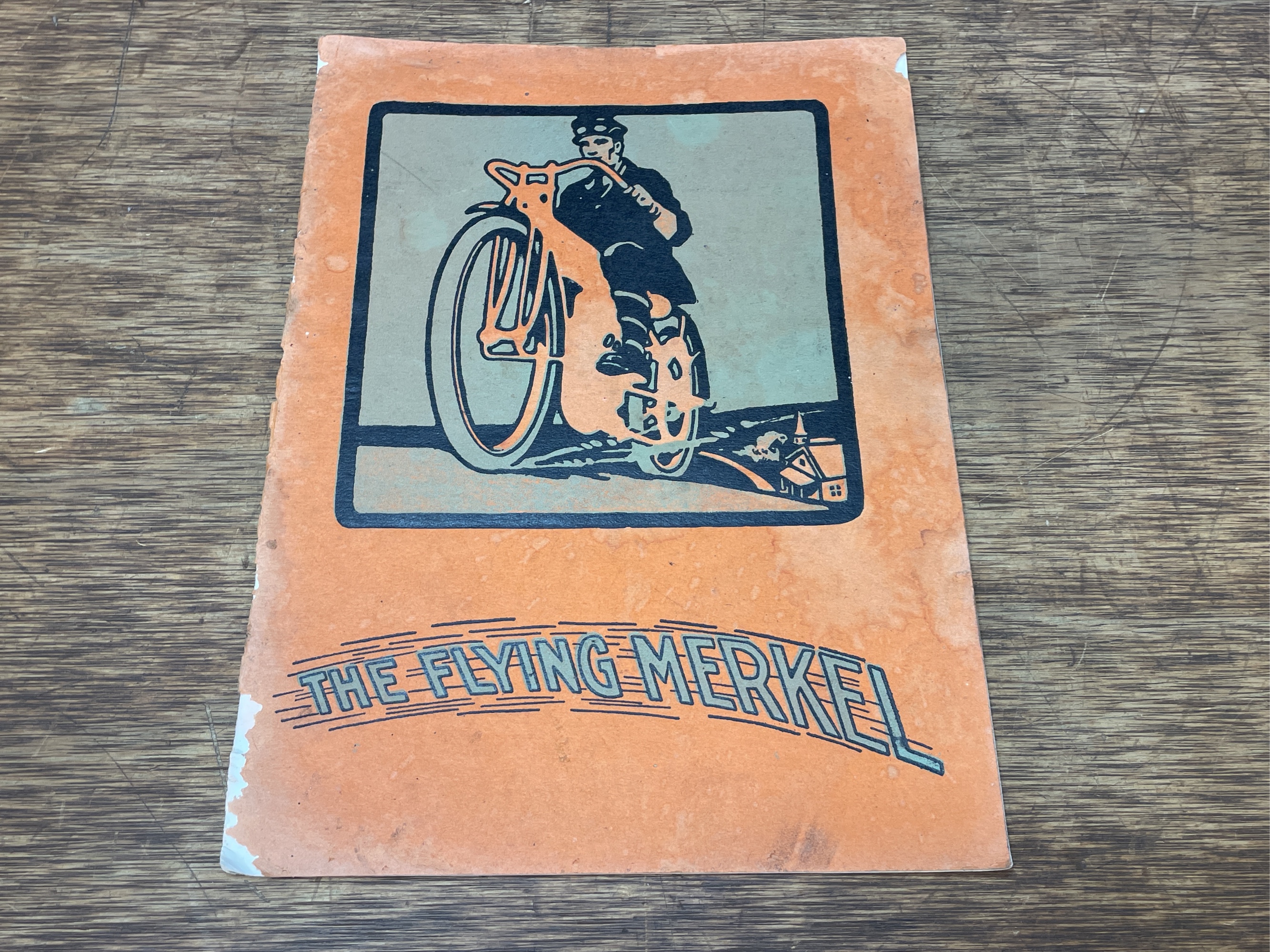 1913 Miami Cycle & Mfg. Co. Flying Merkel Motorcycle catalog. Shows wear, damage, missing back cover, and staining.