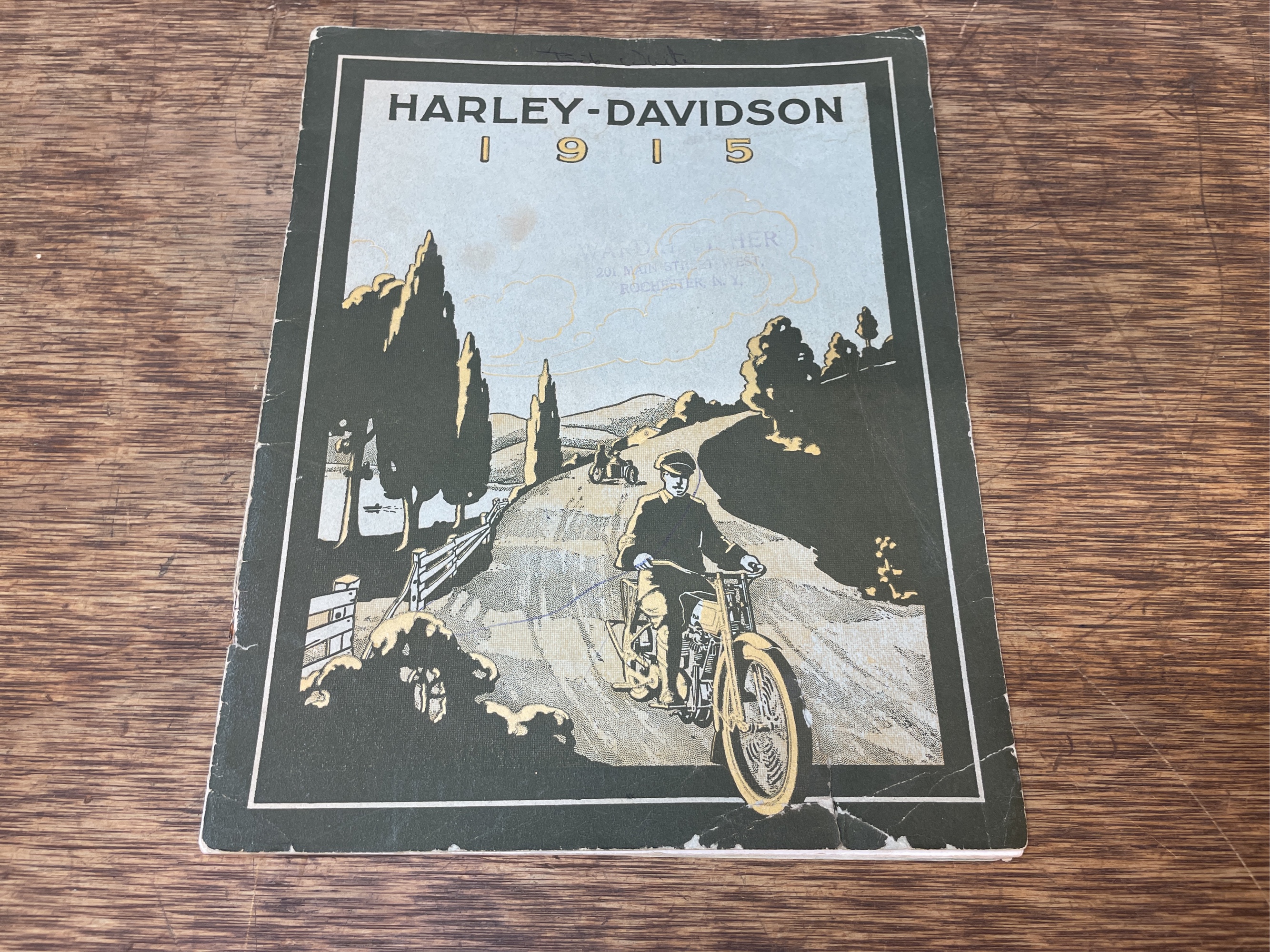 1915 Harley-Davidson Motorcycles catalog. Shows wear, splitting on seam, and tape repaired tear on back cover.