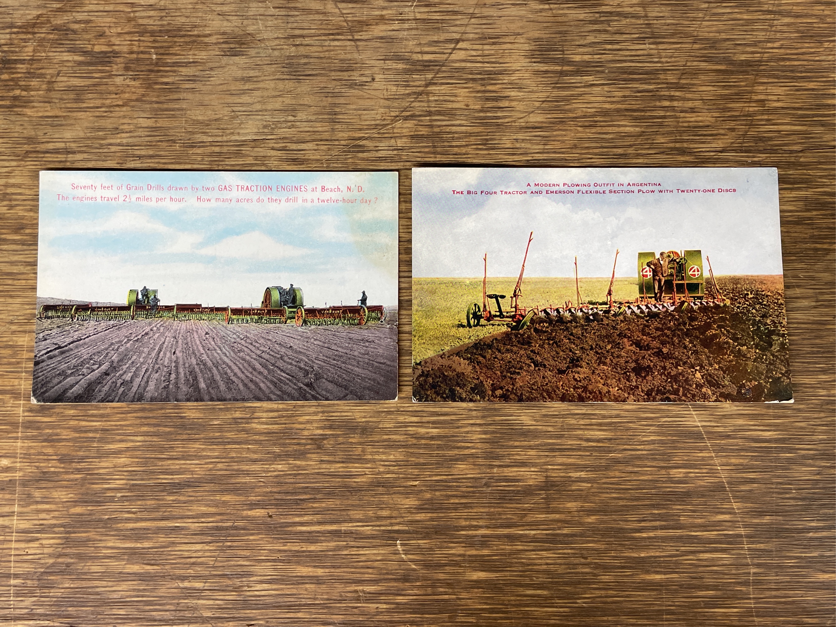 Two Gas Traction Co. / Emerson Brantingham Big 4 tractor postcards. Both show light wear.