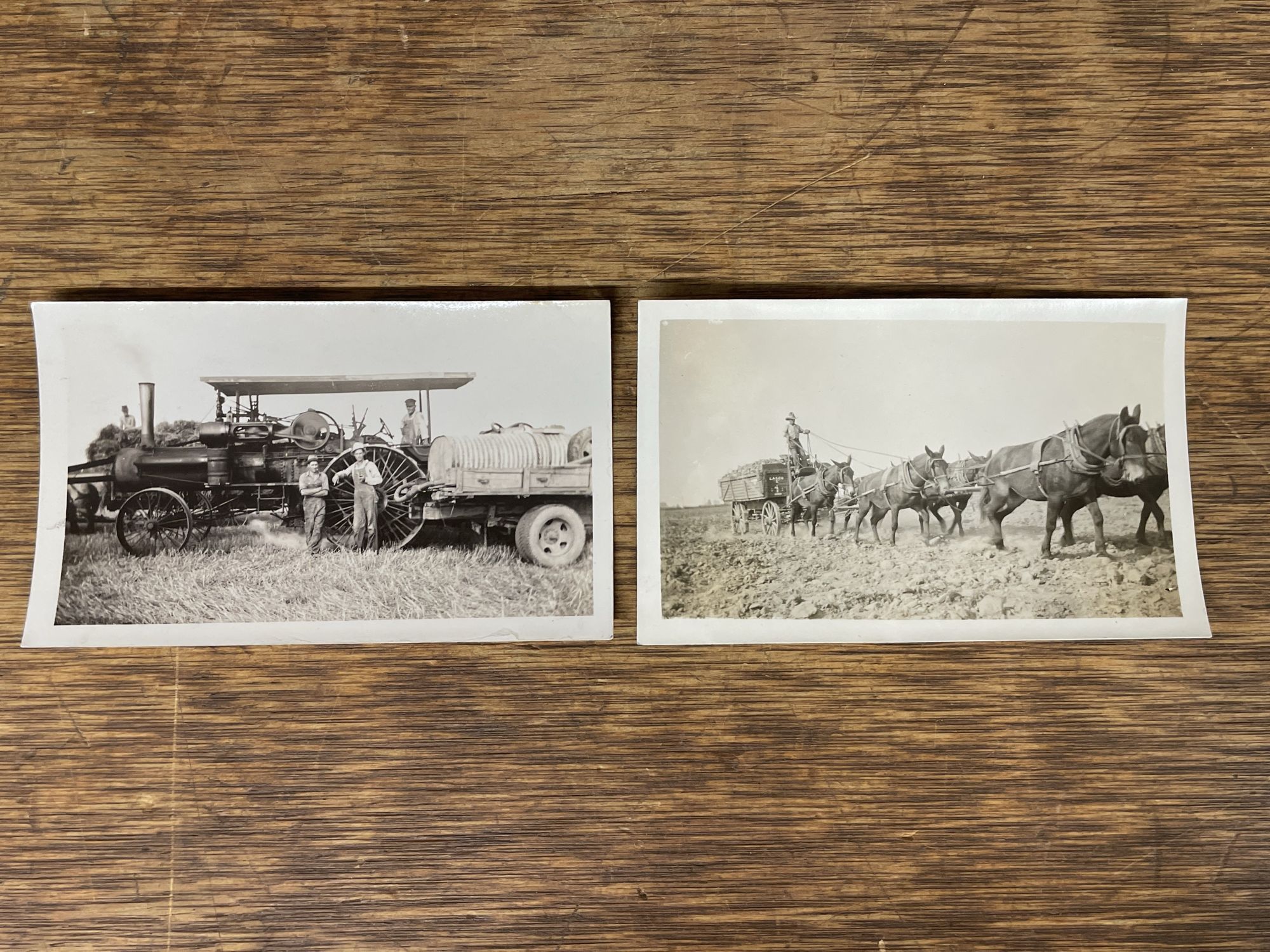 Steam engine photo. Team of horses pulling wagon photo. Both show light wear. Both 4.5"x2.75".