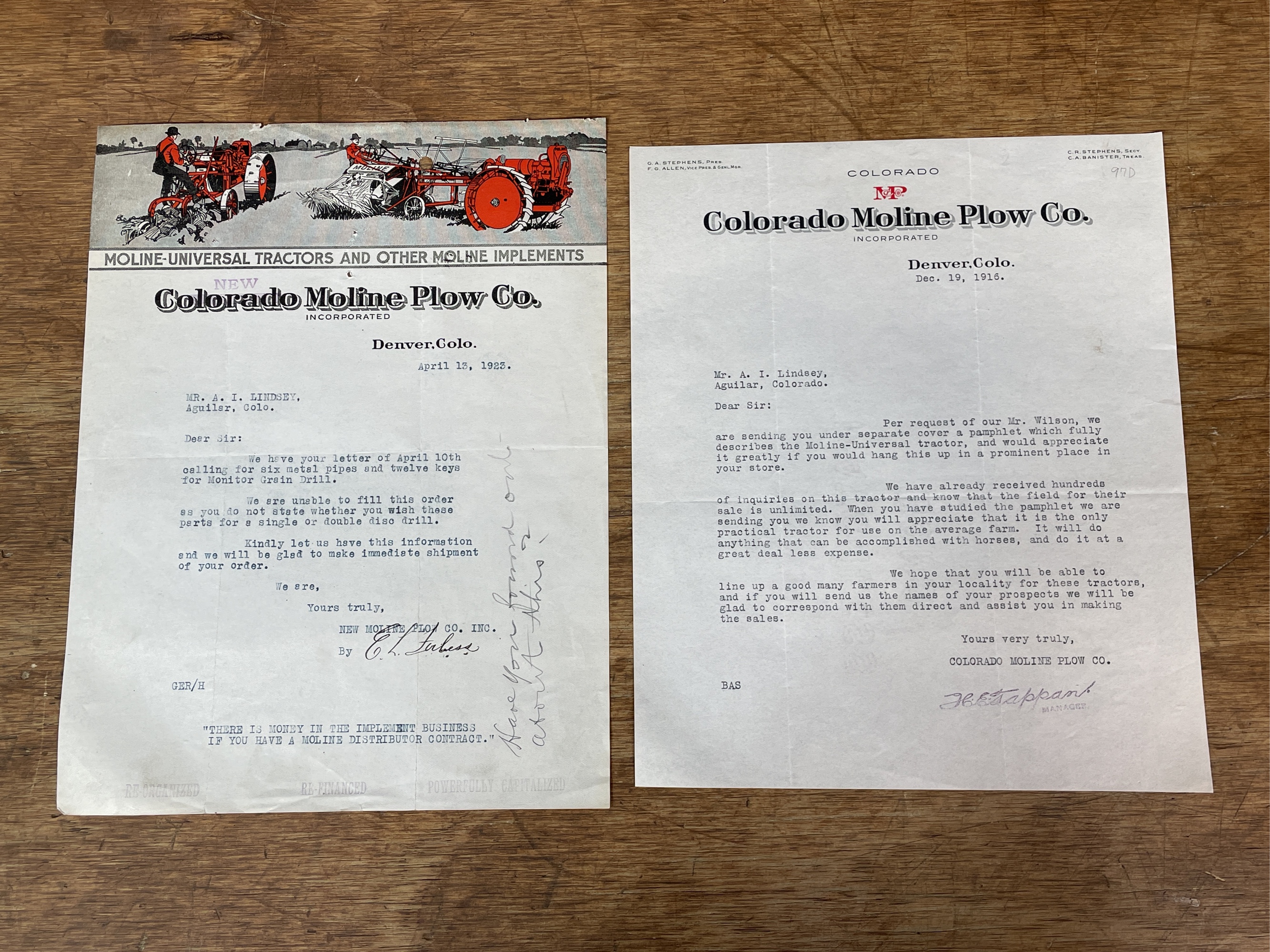 Two 1916 + 1923 Colorado Moline Plow Co. letters. Show light wear.