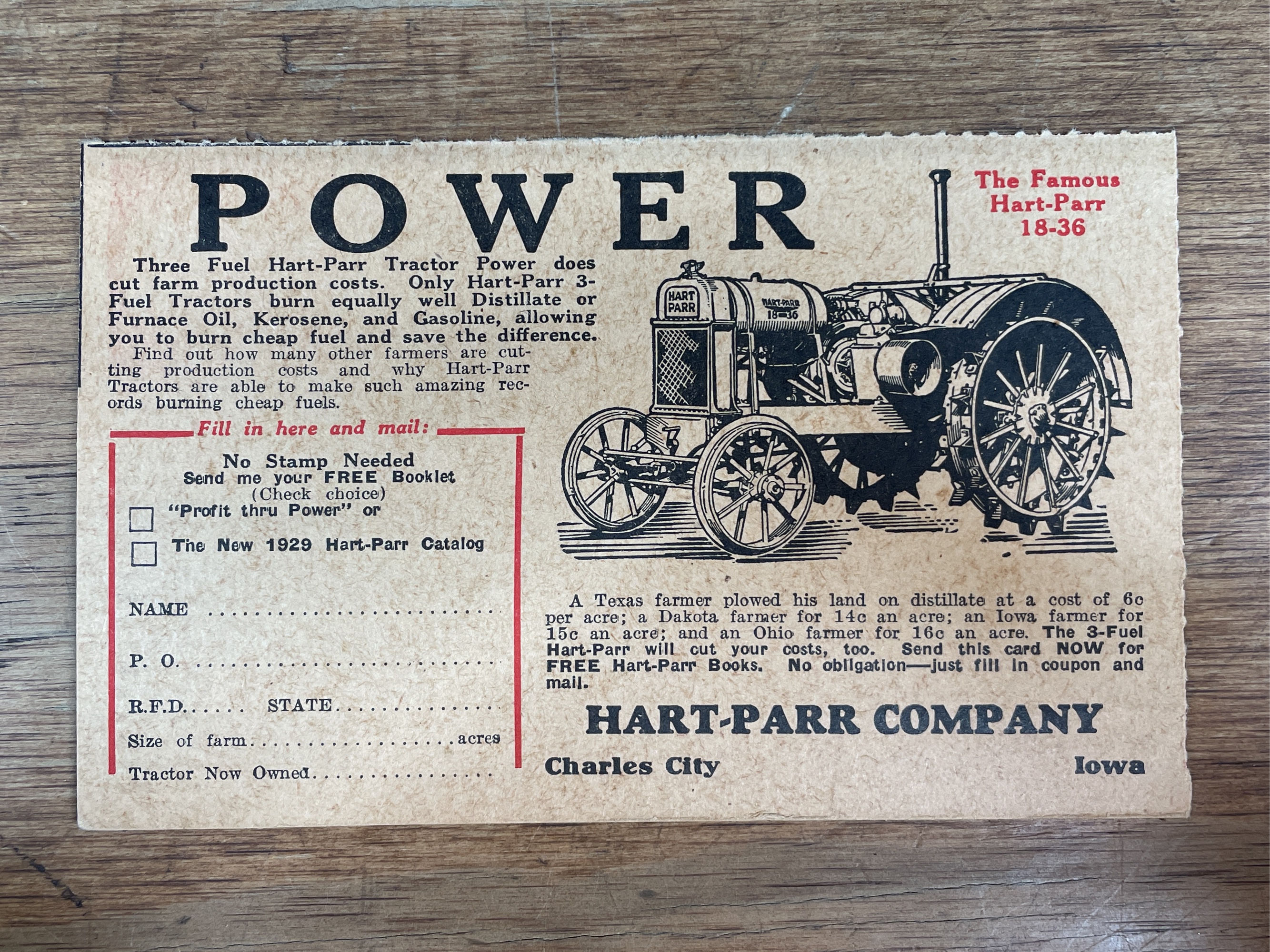 Hart-Parr reply postcard. Good condition.