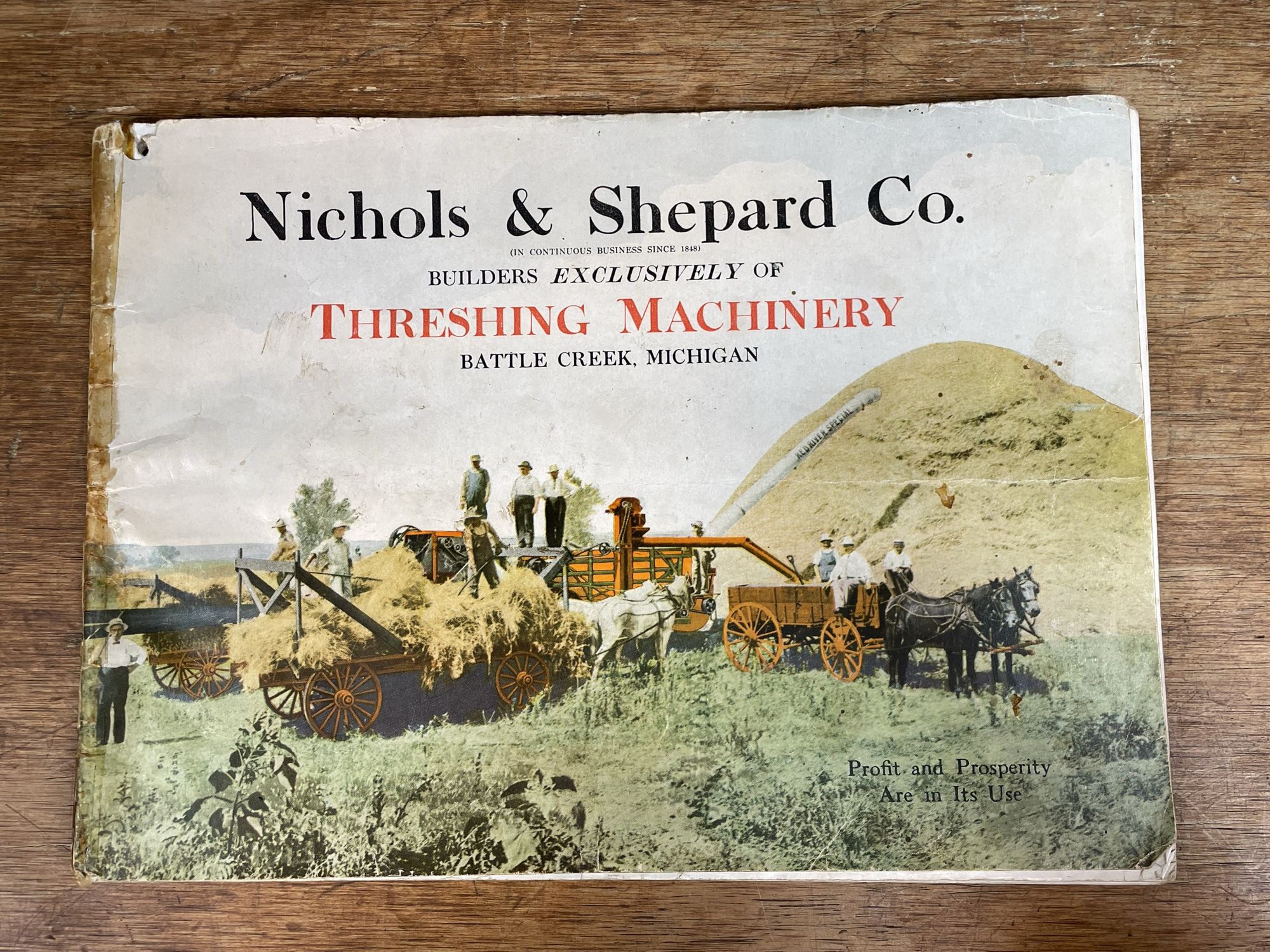 Nichols & Shepard Co. catalog. Shows wear, staining, with splitting and tape on seam.