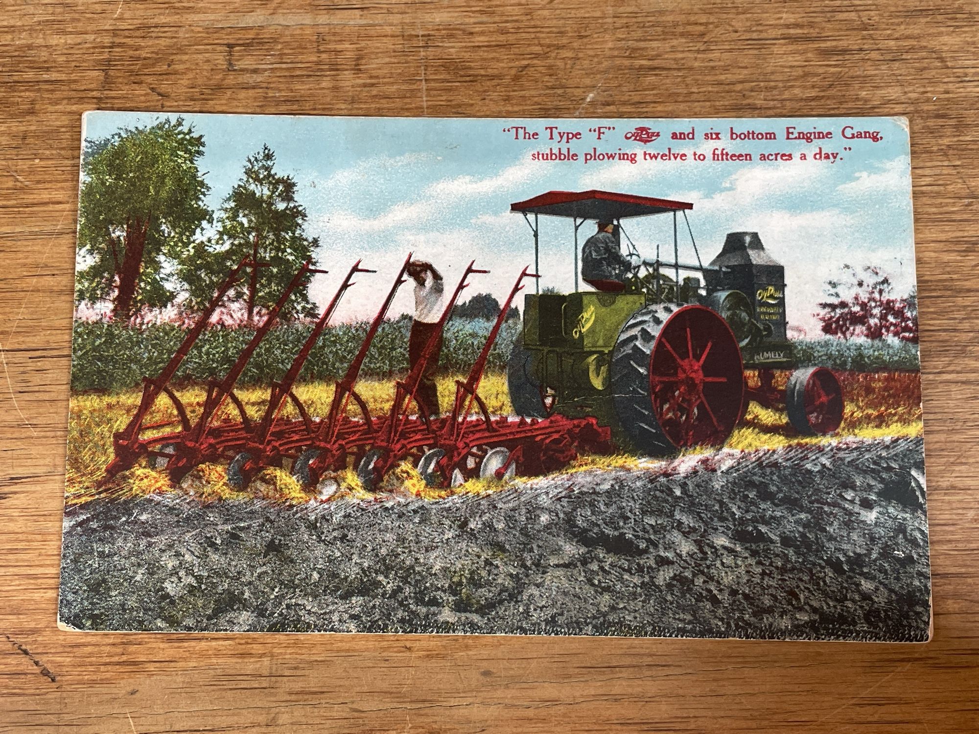 Rumely Oil Pull Model F tractor postcard. Shows light wear.