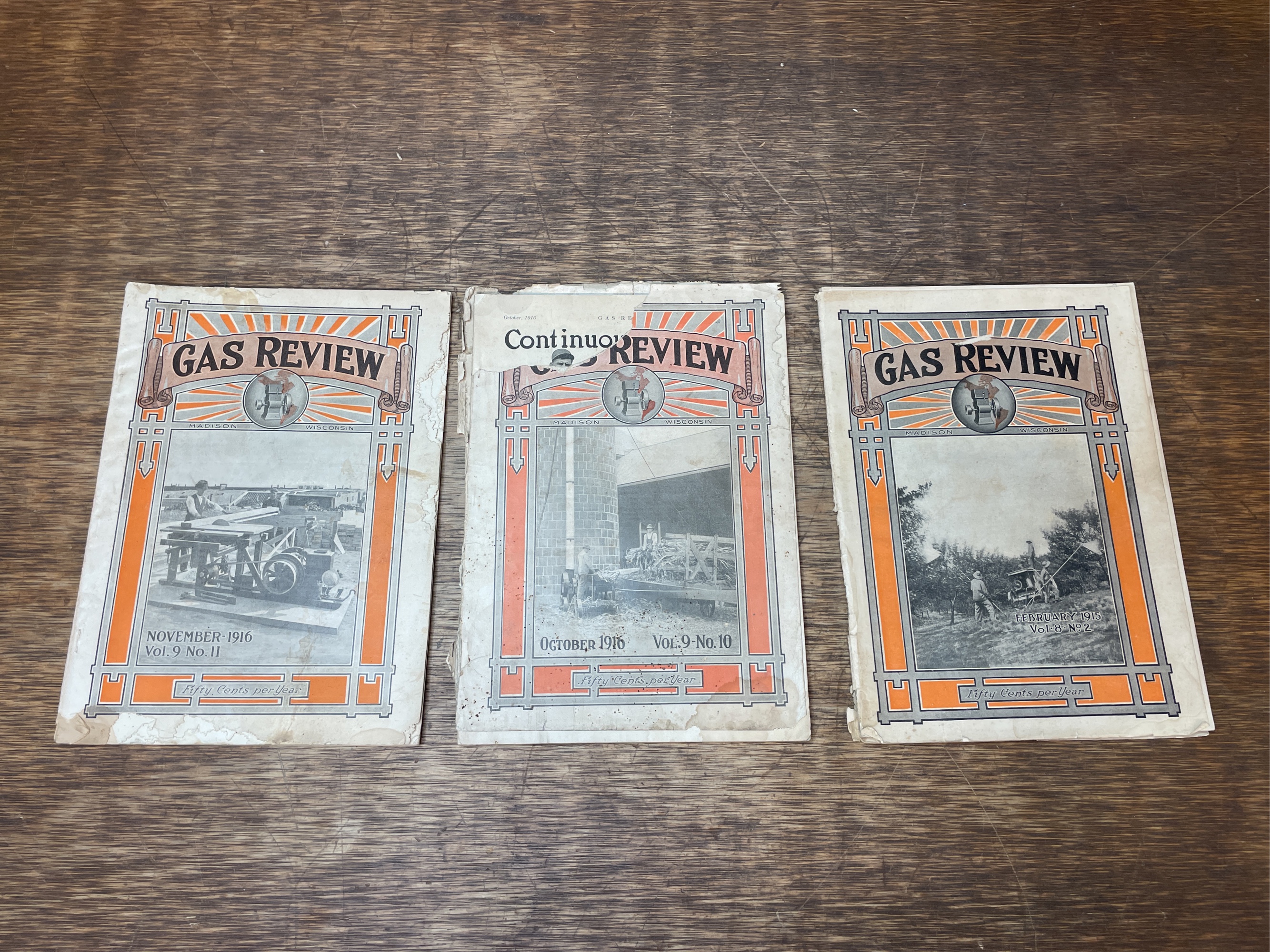 February 1915, October + November 1916 Gas Review magazines. All show wear, damage, and staining.