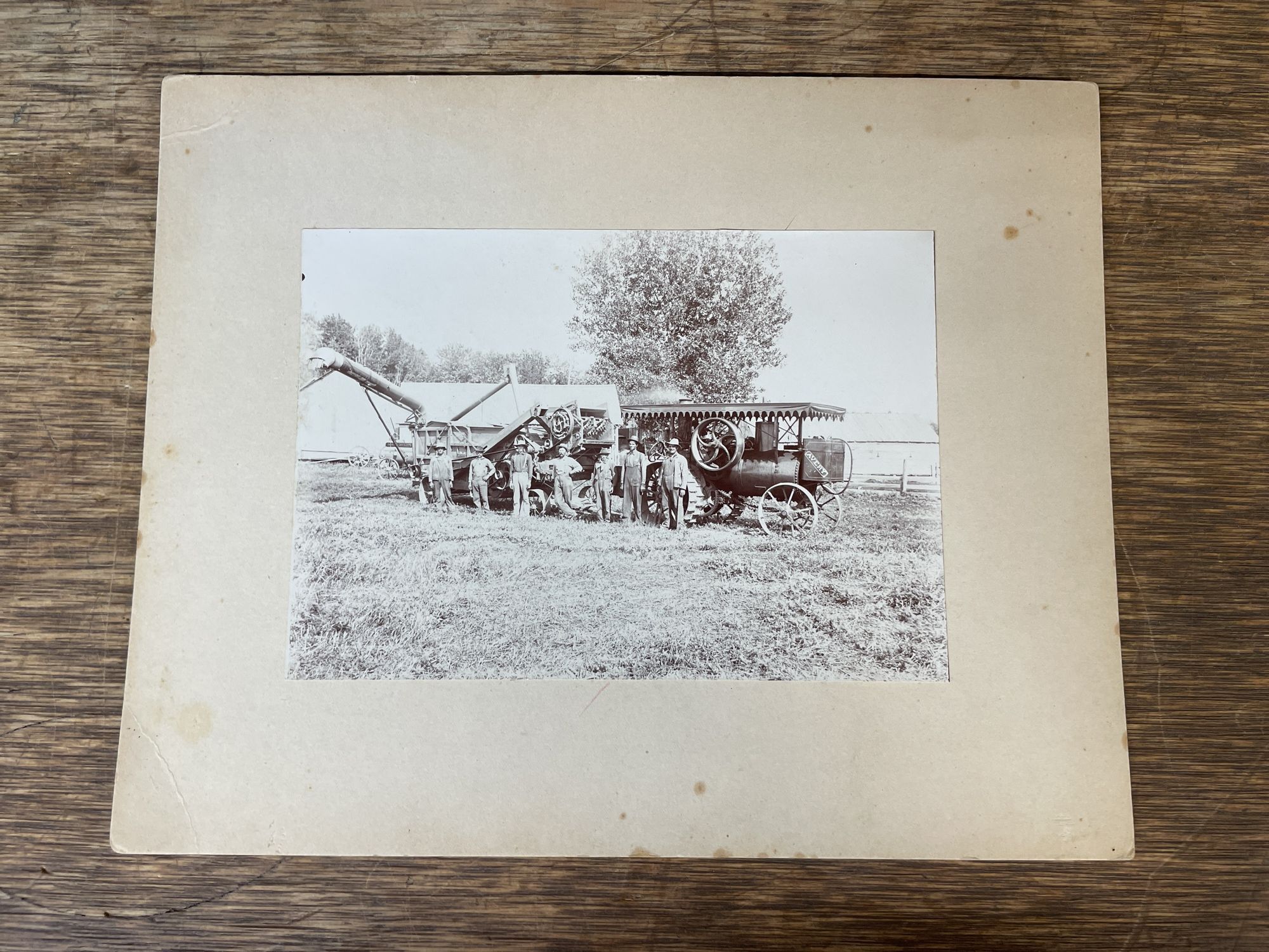 Avery steam engine with threshing machine photo. Shows light wear. 10" x 8" overall.