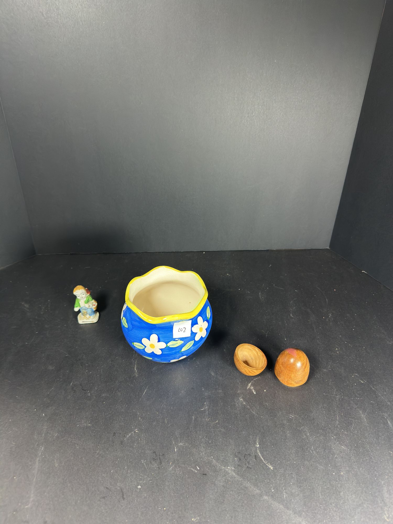 This lot features a small, vibrant blue flower pot adorned with white floral designs and a yellow trim. Accompanying the pot is a miniature figurine of a child and two small wooden orbs.