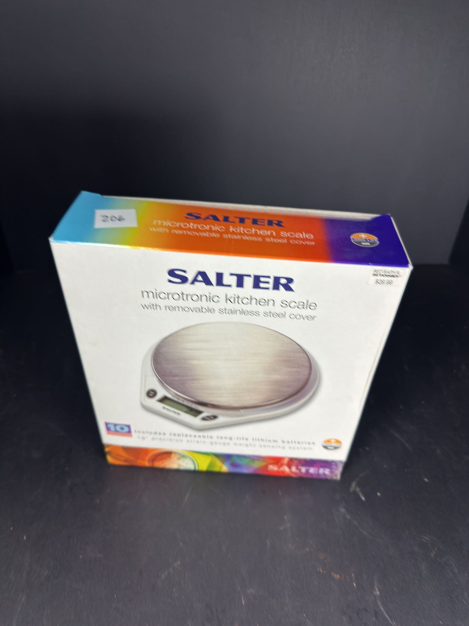 New Salter microtronic kitchen scale with removable stainless steel cover. Model 9886. Includes 10 year guarantee and replaceable long-life lithium batteries.