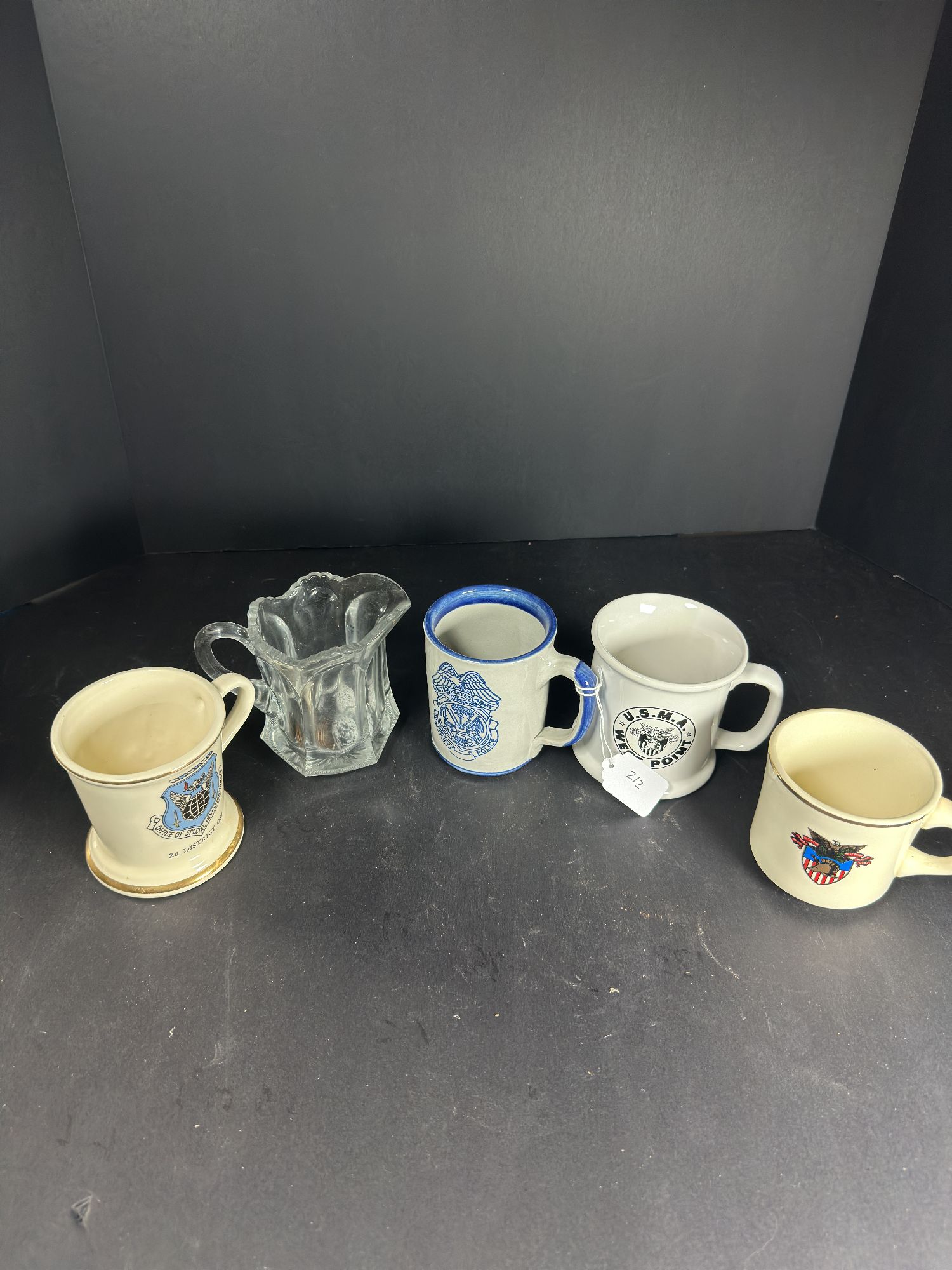 This lot includes a variety of drinkware, featuring multiple mugs with military-themed designs such as U.S. Army and U.S.M.A. West Point, along with a clear glass creamer.