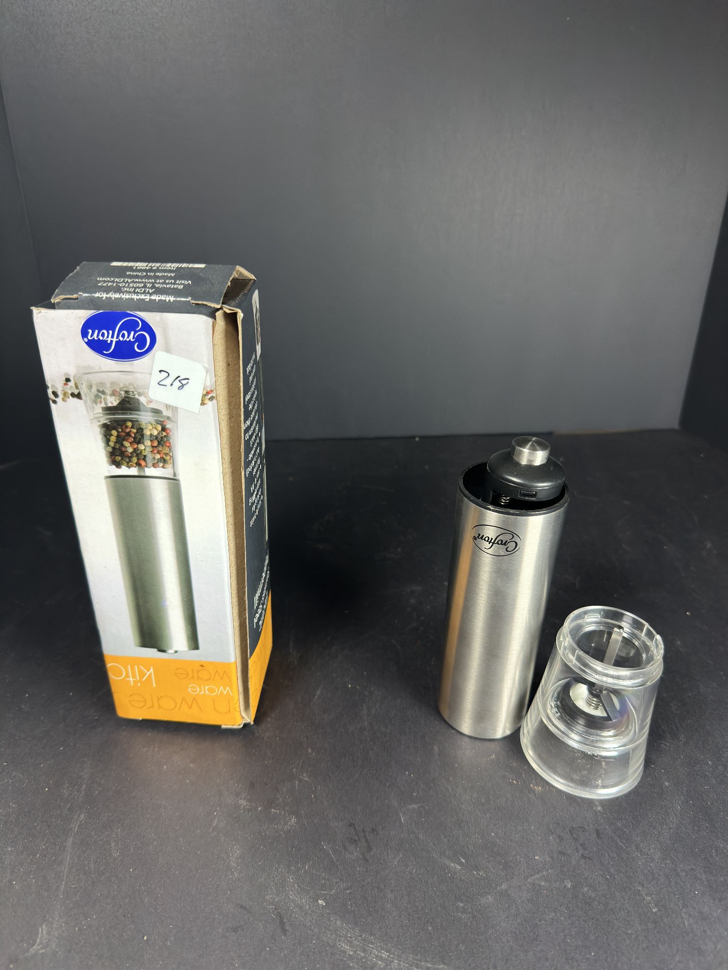This auction features a Crofton Kitchen Ware electric peppermill. It's made of stainless steel and is designed to grind fresh pepper or salt with the touch of a button. It has a clear base for viewing pepper or salt levels. The grind is fully adjustable from fine to coarse.