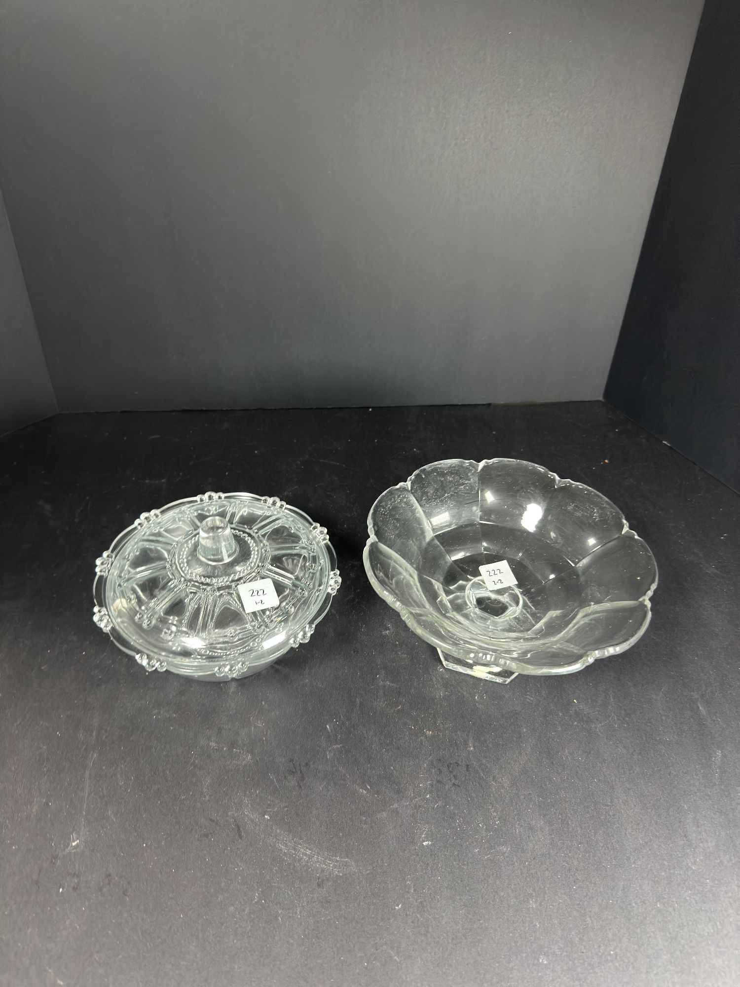 This listing includes a clear glass candy dish with a lid and a clear glass footed bowl. Both feature intricate patterns and designs.