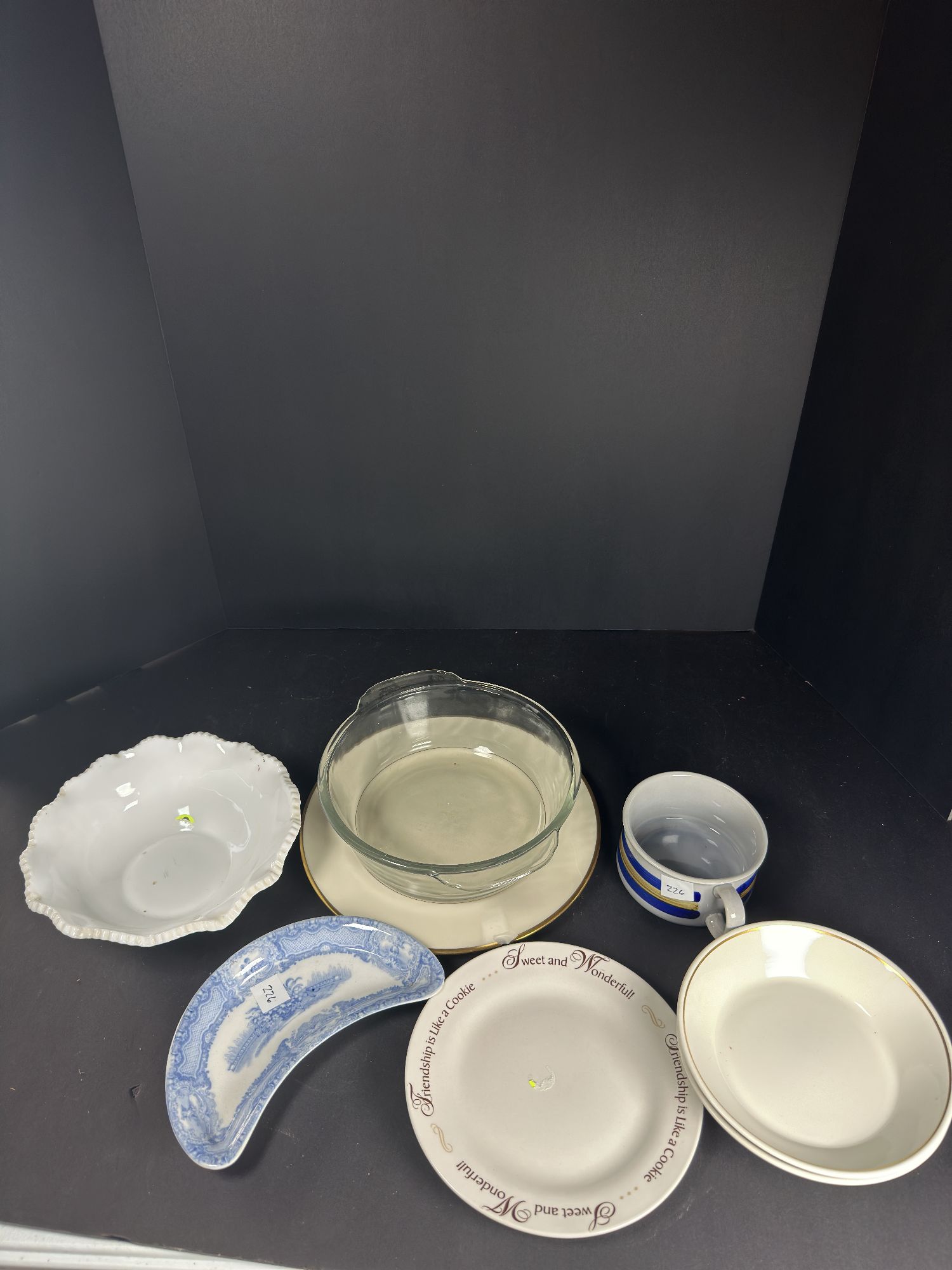 This lot includes a variety of decorative plates and a glass bowl. The plates include a blue and white crescent-shaped plate, a plate with the inscription "Friendship is Like a Cookie, Sweet and Wonderful", a white plate with a gold rim, a white bowl with a fluted rim, and a small striped mug.