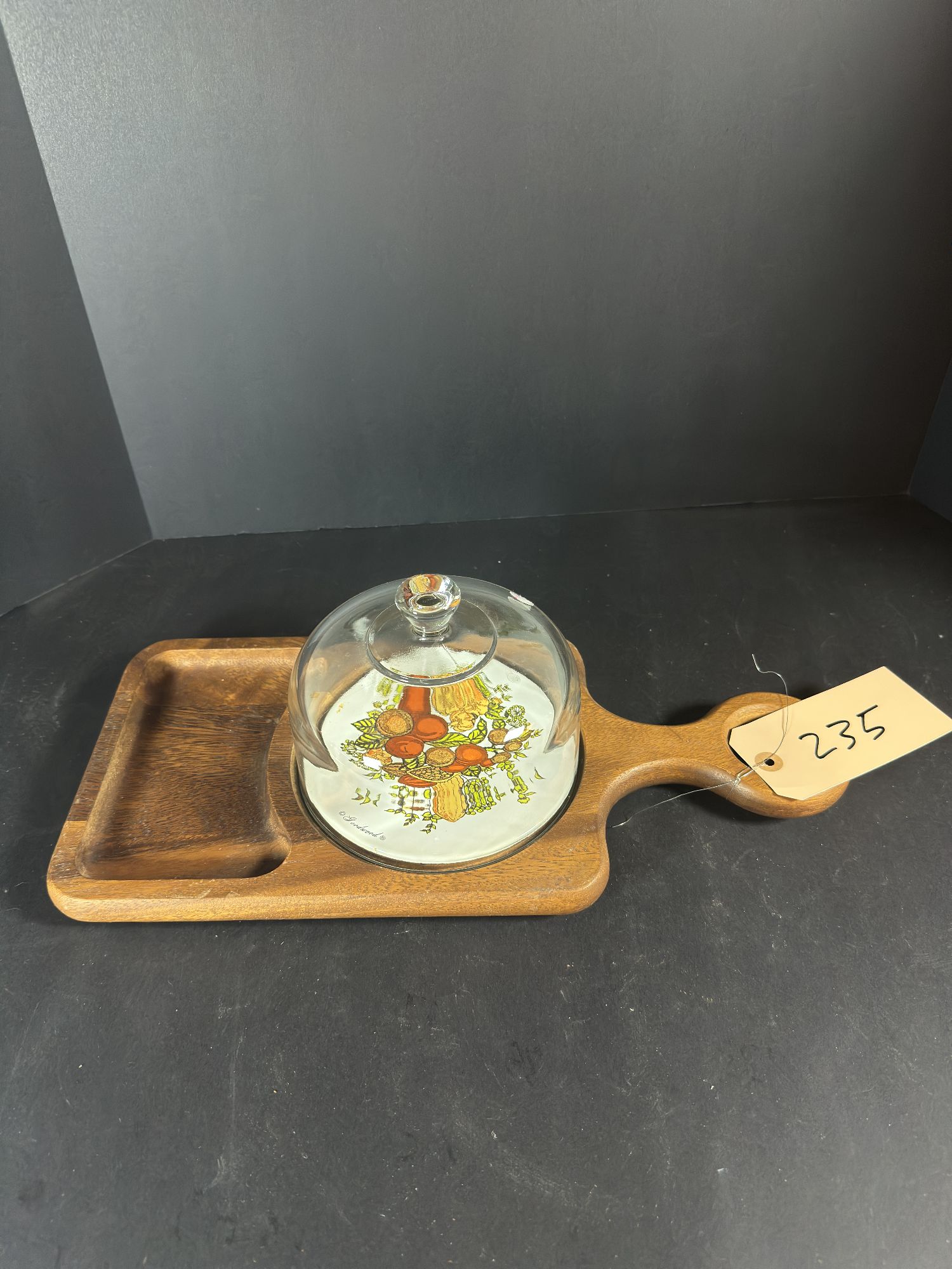 Wood cheese board with a fruit patterned ceramic insert and a glass domed lid.