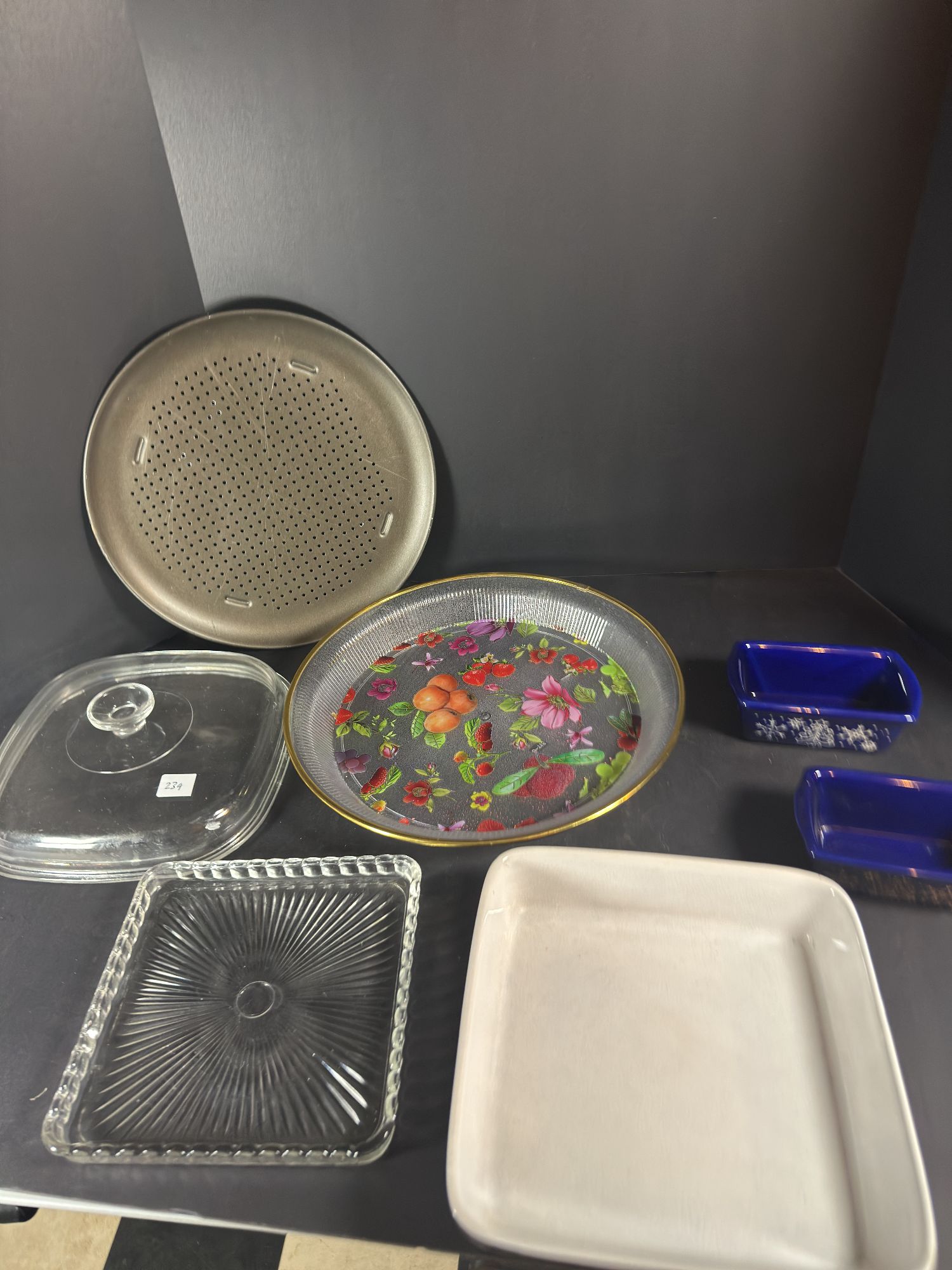 Collection of various kitchen serving items, including decorative trays, baking pans, casserole dish lid, and other dishware.