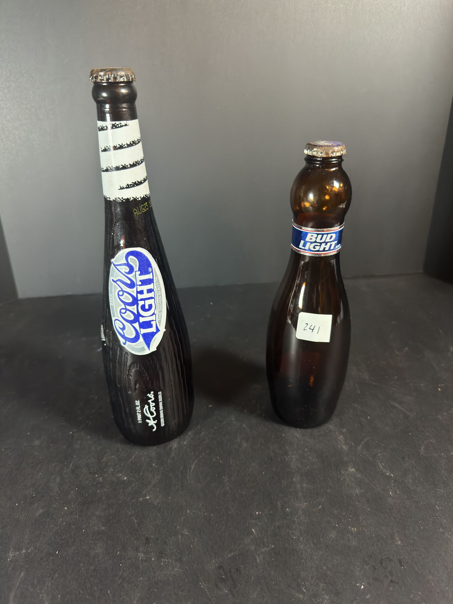 Two novelty beer bottles shaped like bowling pins. One is a Coors Light bottle, and the other is a Bud Light bottle.