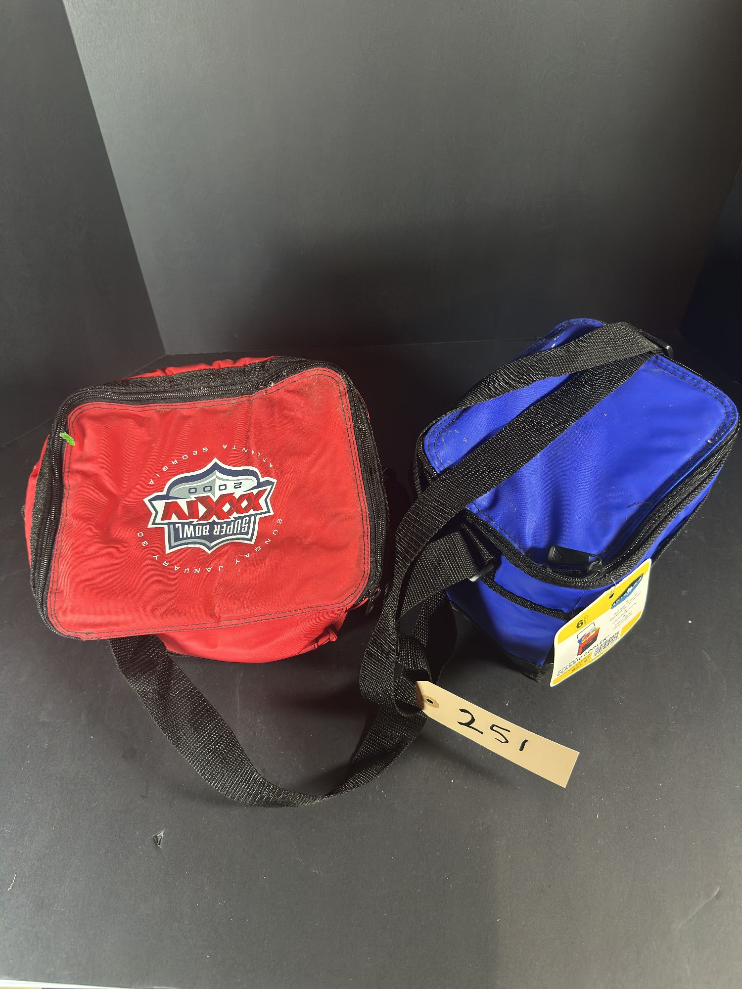 You are bidding on two insulated lunch boxes. One is red and features Super Bowl XXXIV Atlanta Georgia branding. The other is a blue Arctic Zone insulated classic cooler, still with tag.