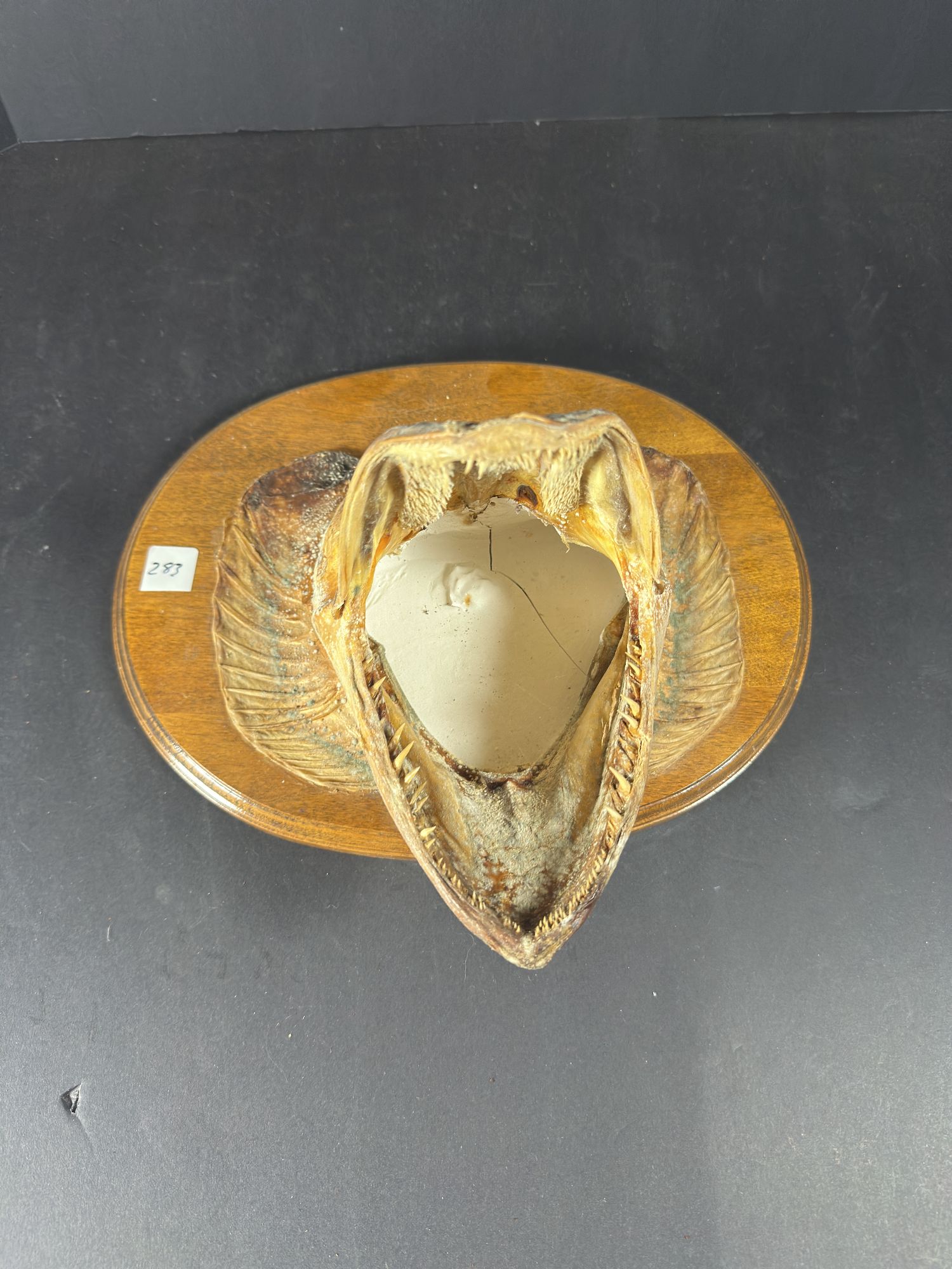 Taxidermied fish head mounted on a wooden plaque. Great for any collector!