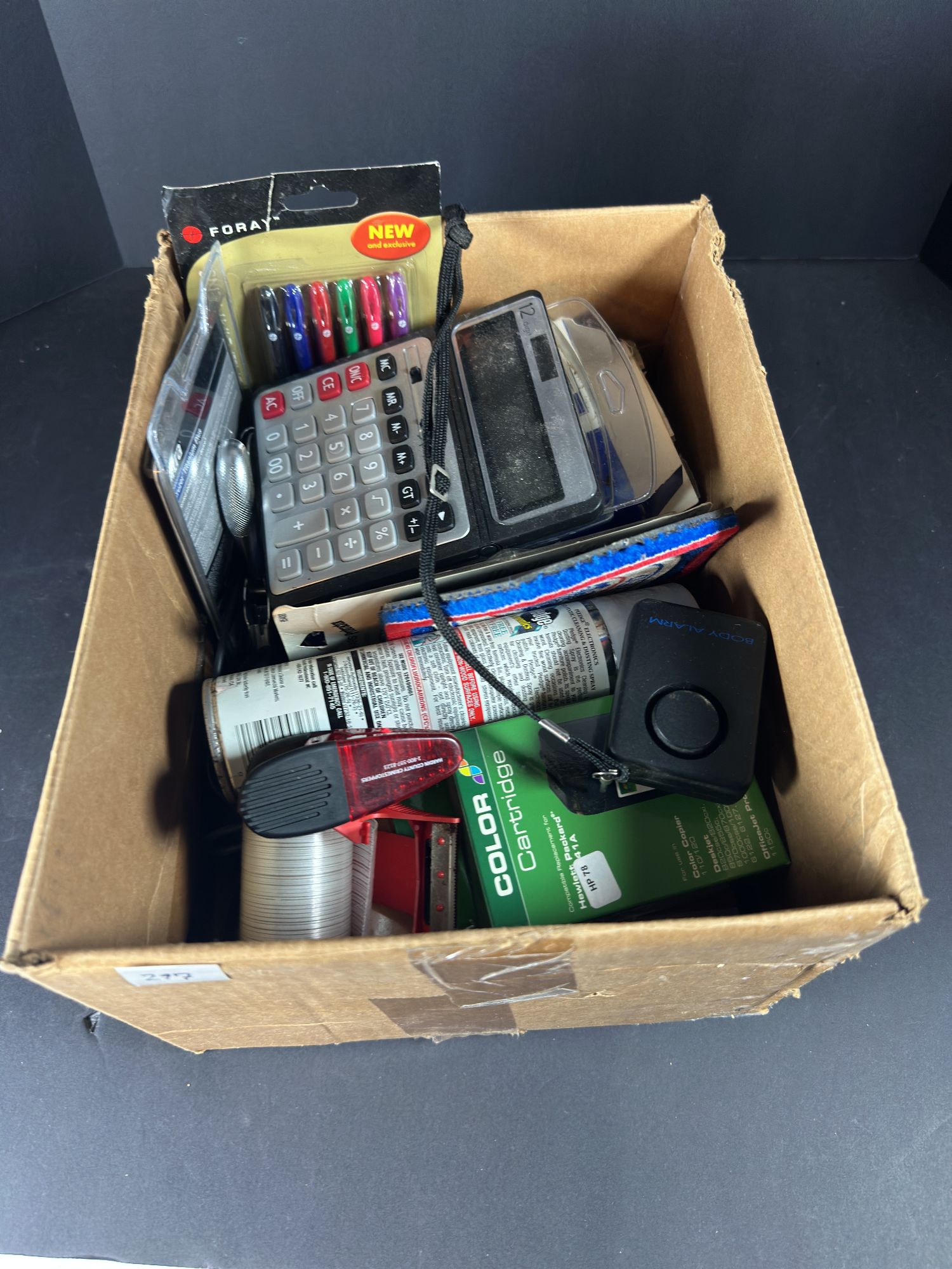 Box Lot of Office Supplies - Pens, Calculators, and More