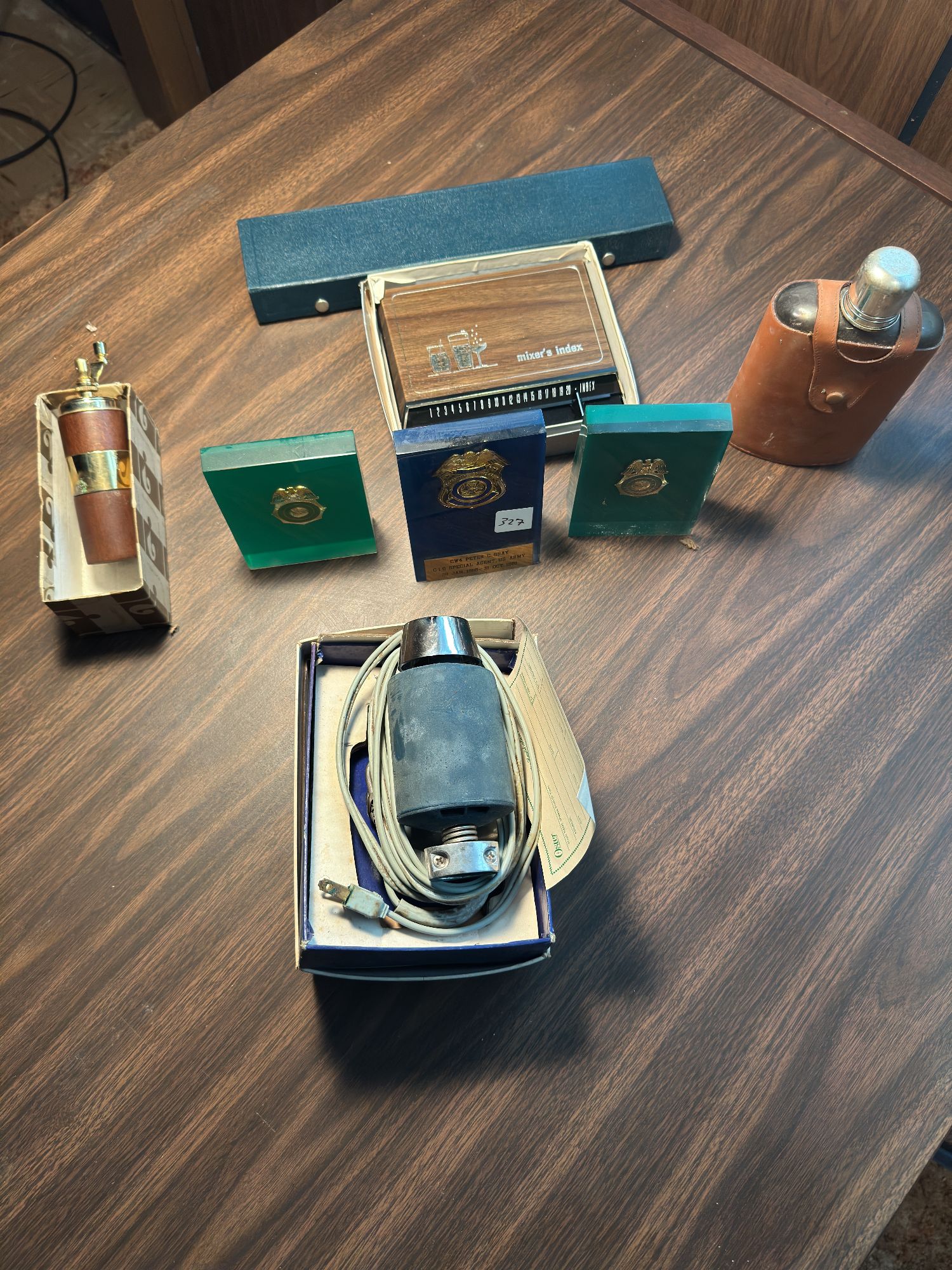 Collection features a CW4 Peter G. Gray CID Special Agent U.S. Army badge in a blue presentation case, a matching green badge, a Mixer's Index recipe guide, an electric massager, and a leather-clad flask.