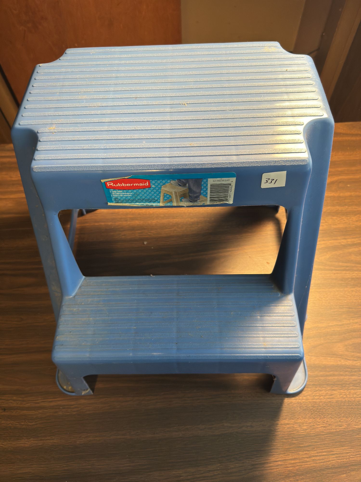 This auction features a blue Rubbermaid two-step stool. It's perfect for reaching those out-of-reach places!