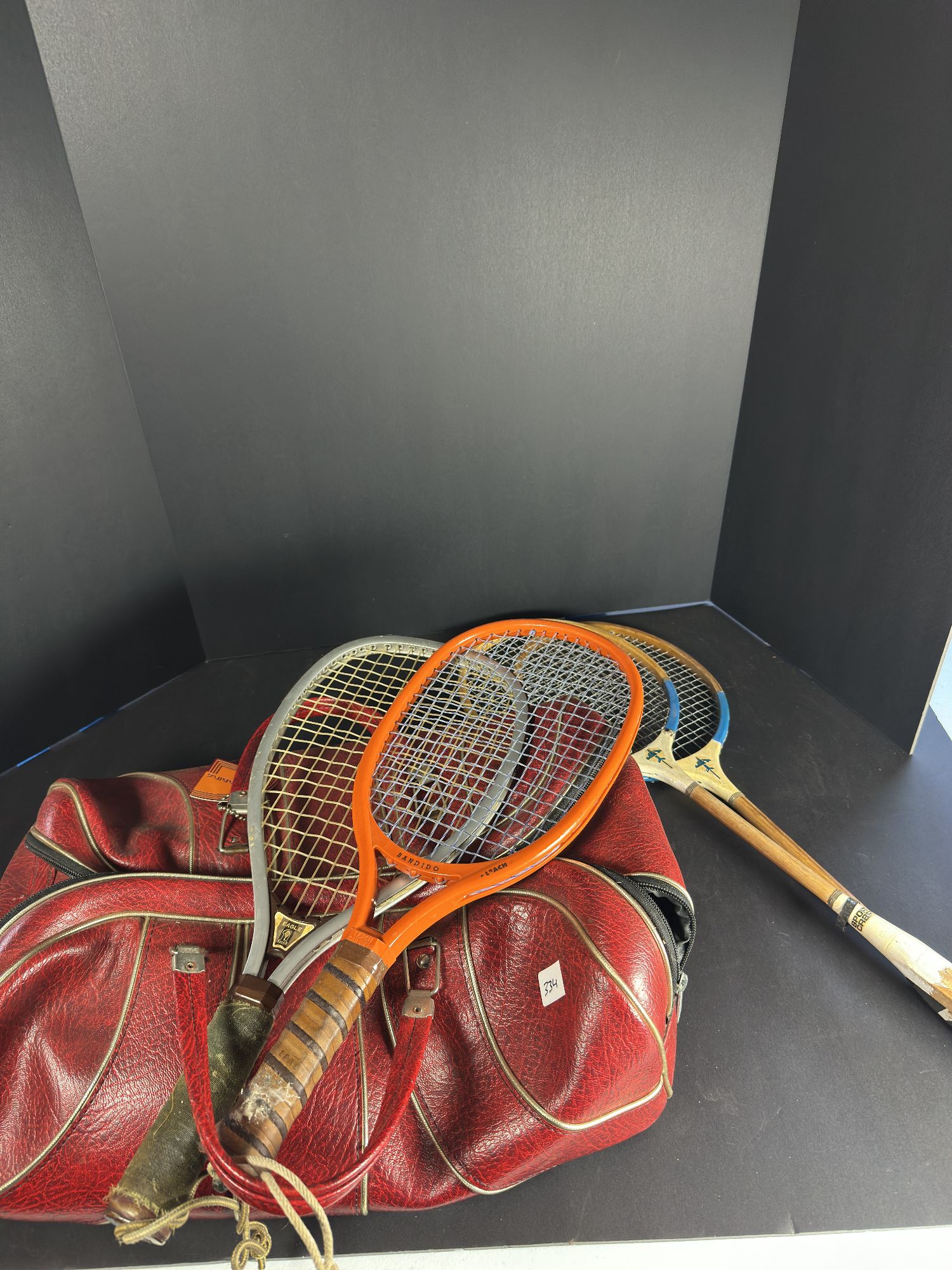 Three tennis rackets, including one orange 'Randido -L'tach' racket and two wooden rackets with blue and white accents, along with a red sports bag.