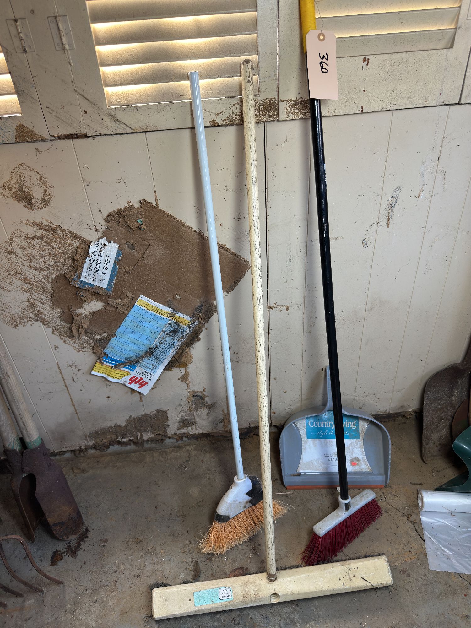 Included in this lot are three push brooms with varying bristle types, as well as a plastic dustpan.