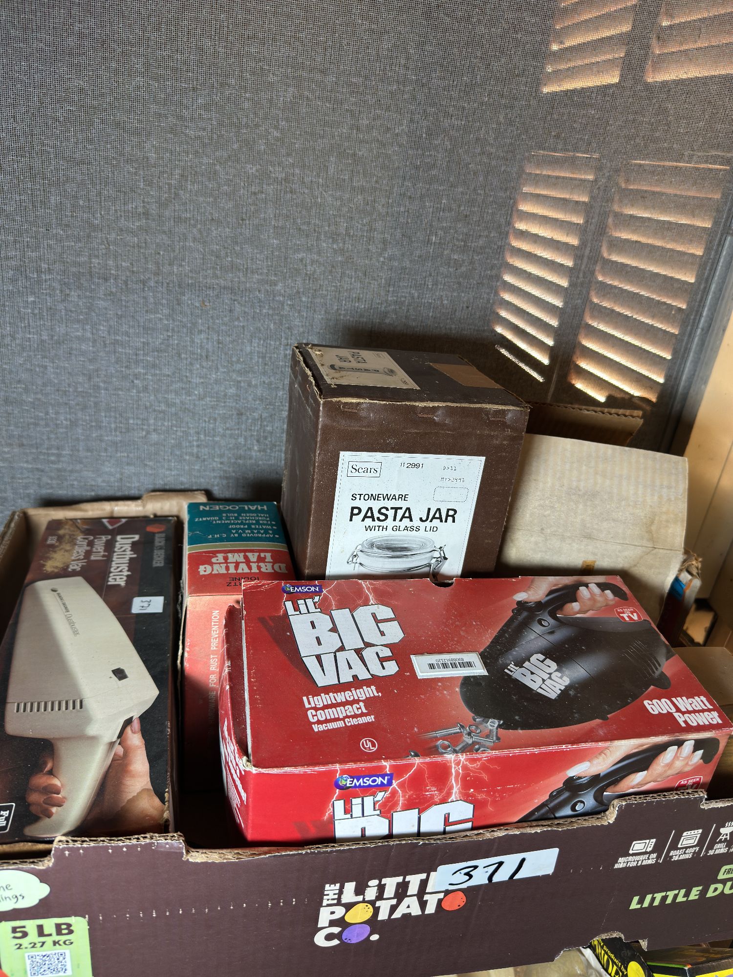 This lot includes a variety of household items, featuring boxed vacuum cleaners such as a "Big Vac" and a "Dustbuster", along with a Sears stoneware pasta jar with a glass lid. Sold as-is.