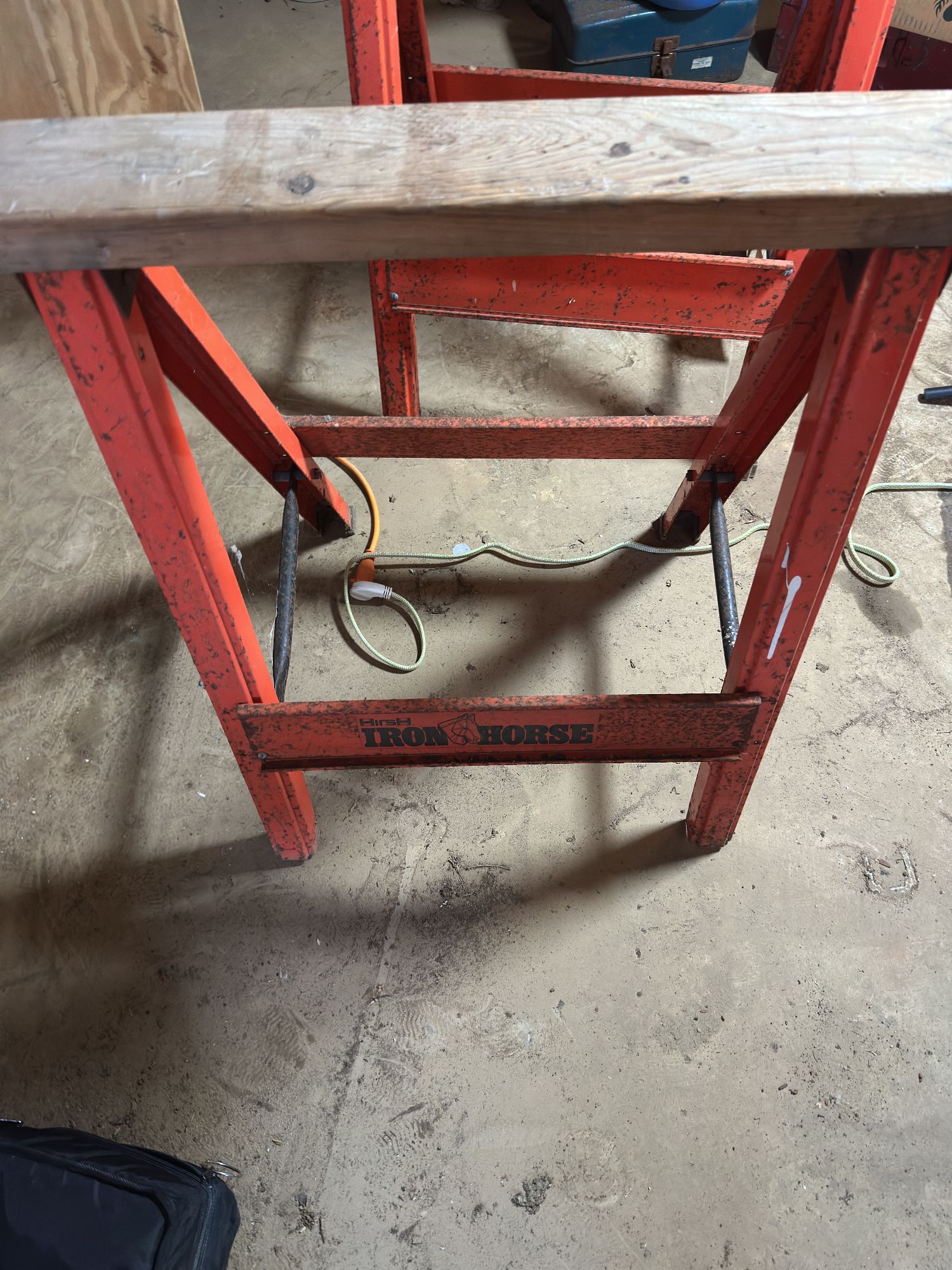 Set of two orange metal sawhorses, marked 'Iron Horse'. Each features a wooden top.