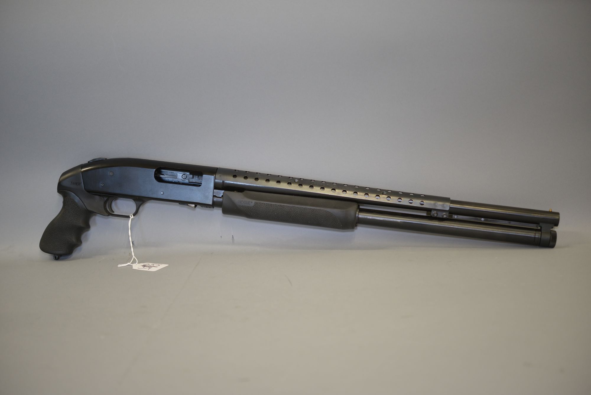 12 gauge, 20 inch barrel, ventilated heat guard on barrel, black rubber Hogue forearm & pistol grip, top tang safety, receiver is drilled and tapped for scope or red dot sight, extended magazine, real nice condition! SN-V0220463.