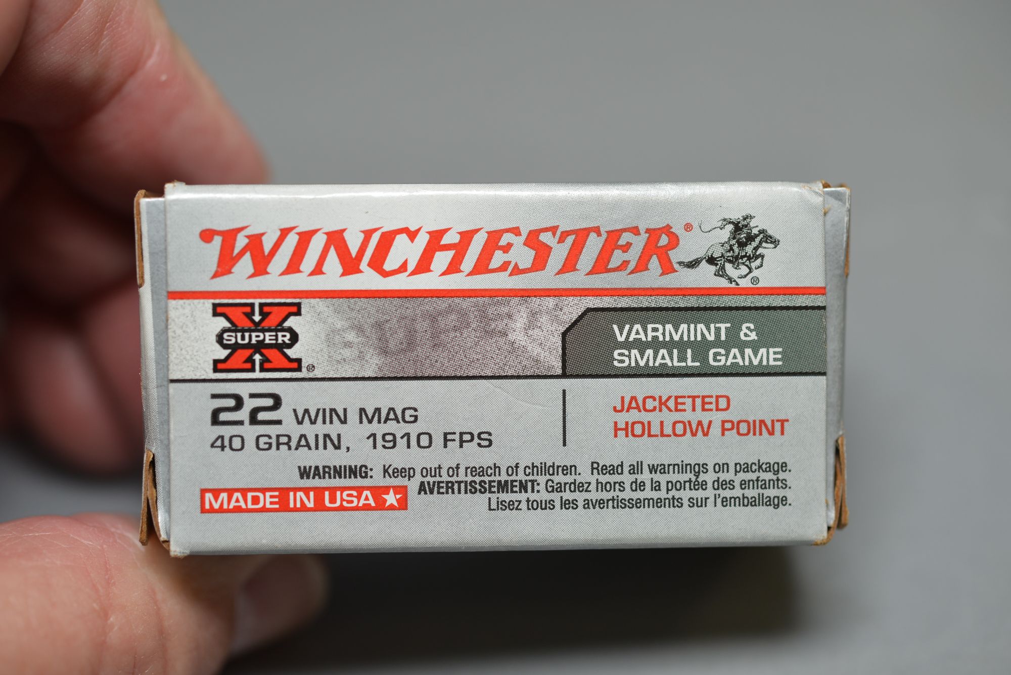 .22 Winchester Magnum Rimfire caliber, box of 50, 40 grain Jacketed Hollow Points with a muzzle velocity of 1910 feet per second! Great for varmints & small game.