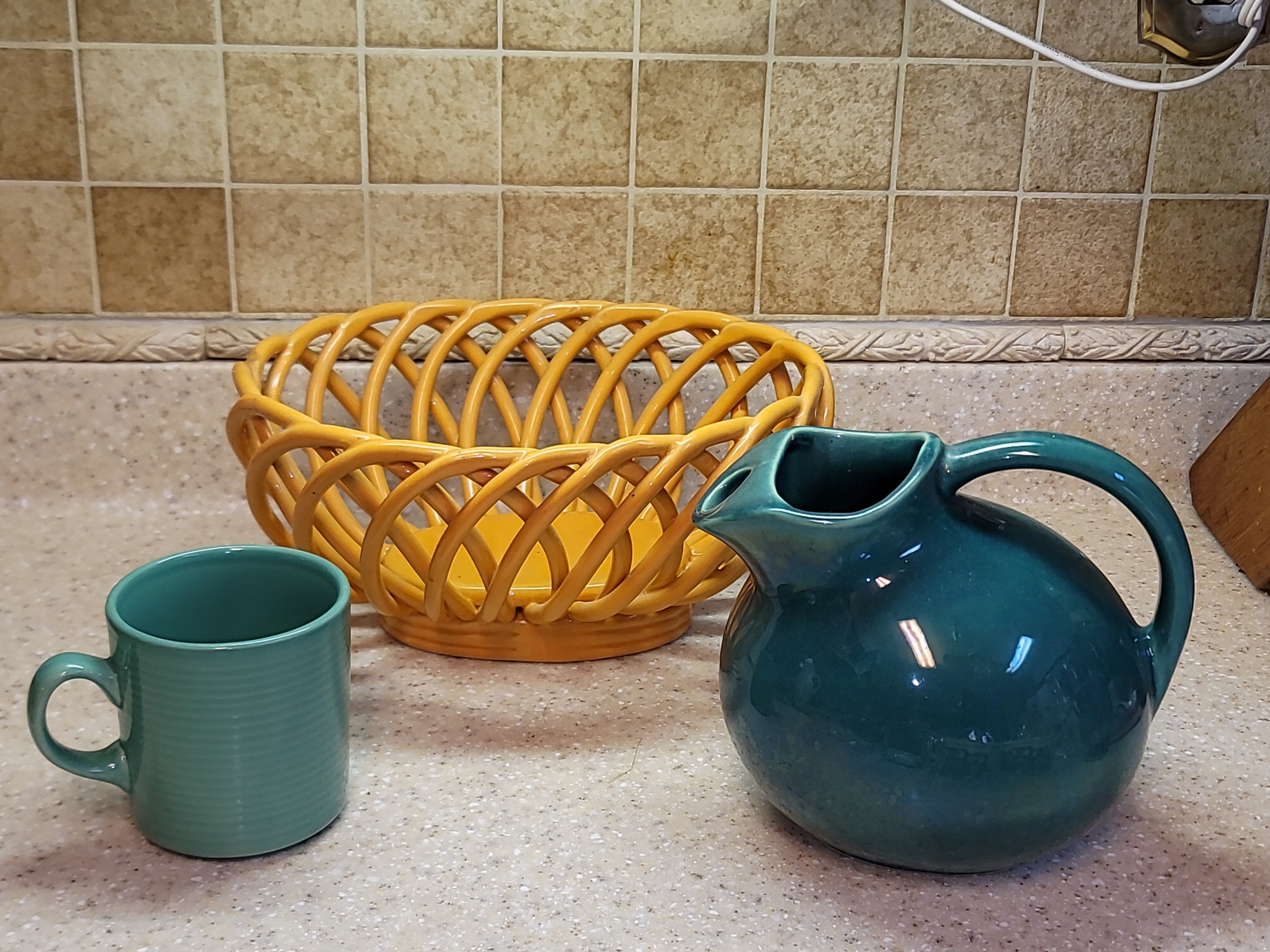 USA Hall 7" pitcher, pastel green mug, and vintage pottery bread basket