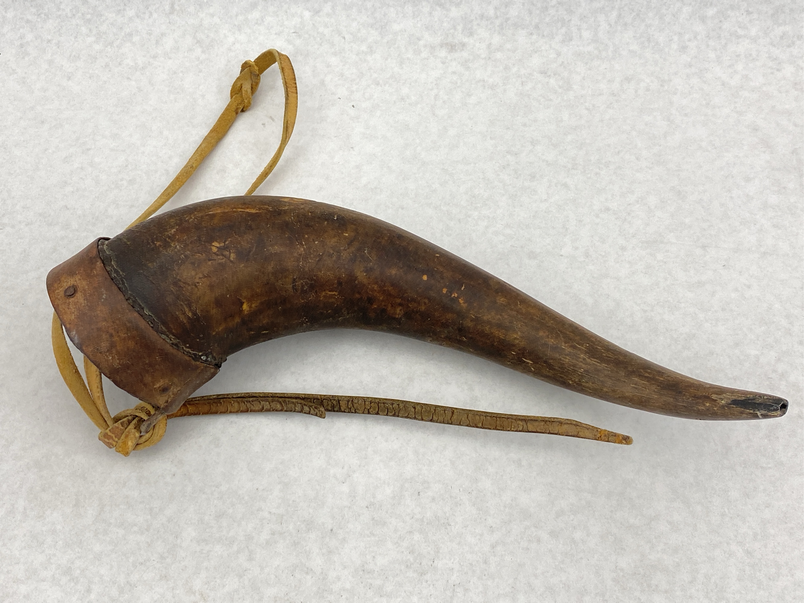 Condition Notes: Horn body shows age-appropriate surface wear and patina with fine crazing throughout. Original wooden plug intact with "US" marking. Leather strap displays expected drying and aging. Small crack near mouthpiece opening. Surface exhibits some minor scuffs and handling marks consistent with field use. No major structural damage. Refer to the pictures and in person inspection for condition.